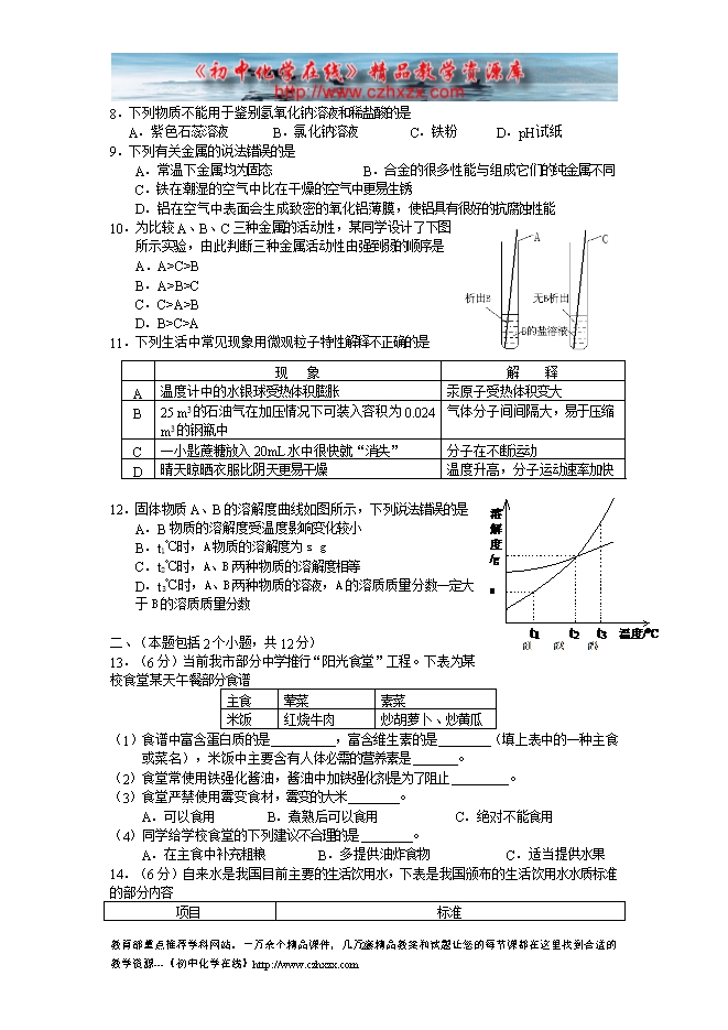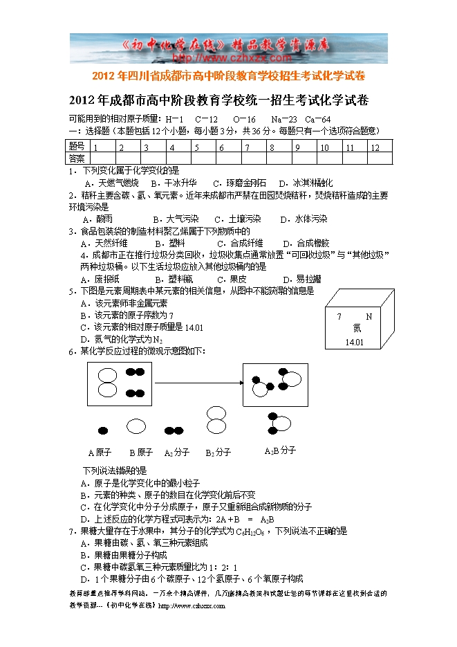 2012年四川省成都市高中阶段教育学校招生考试化学试卷