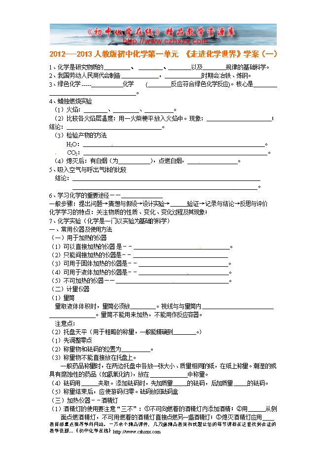 2012---2013人教版初中化学第一单元 《走进化学世界》学案(一)