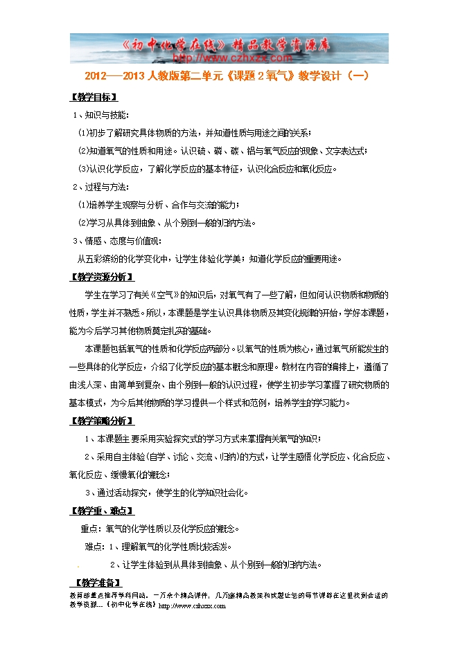 2012---2013人教版第二单元《课题2 氧气》教学设计(一)
