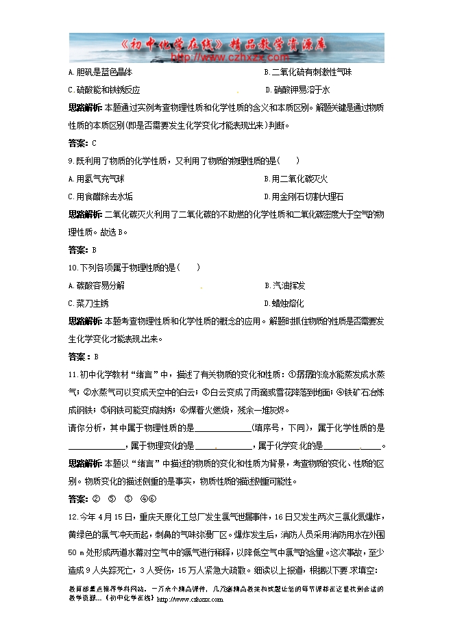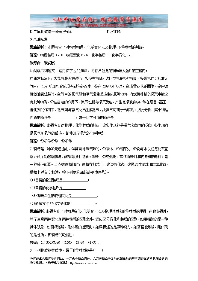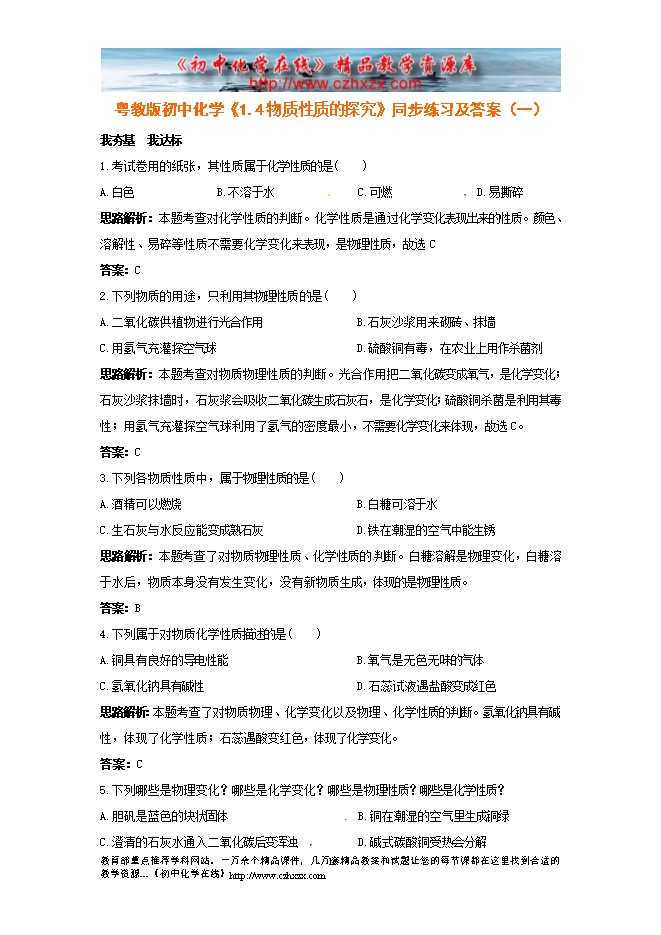 粤教版初中化学《1.4物质性质的探究》同步练习及答案(一)