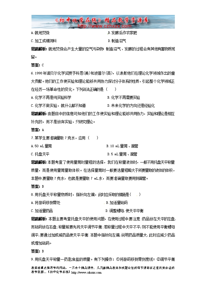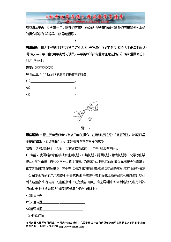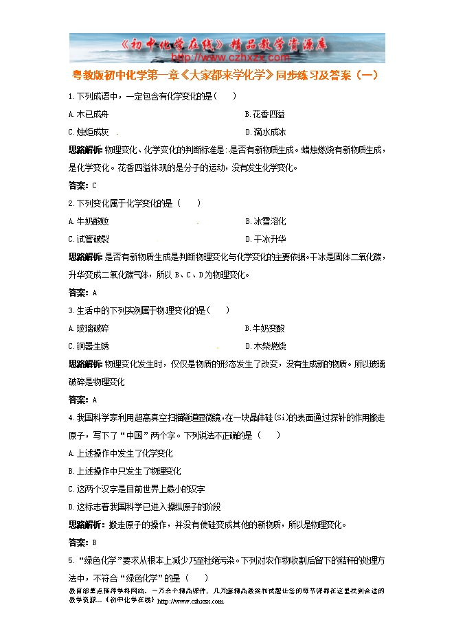 粤教版初中化学第一章《大家都来学化学》同步练习及答案(一)