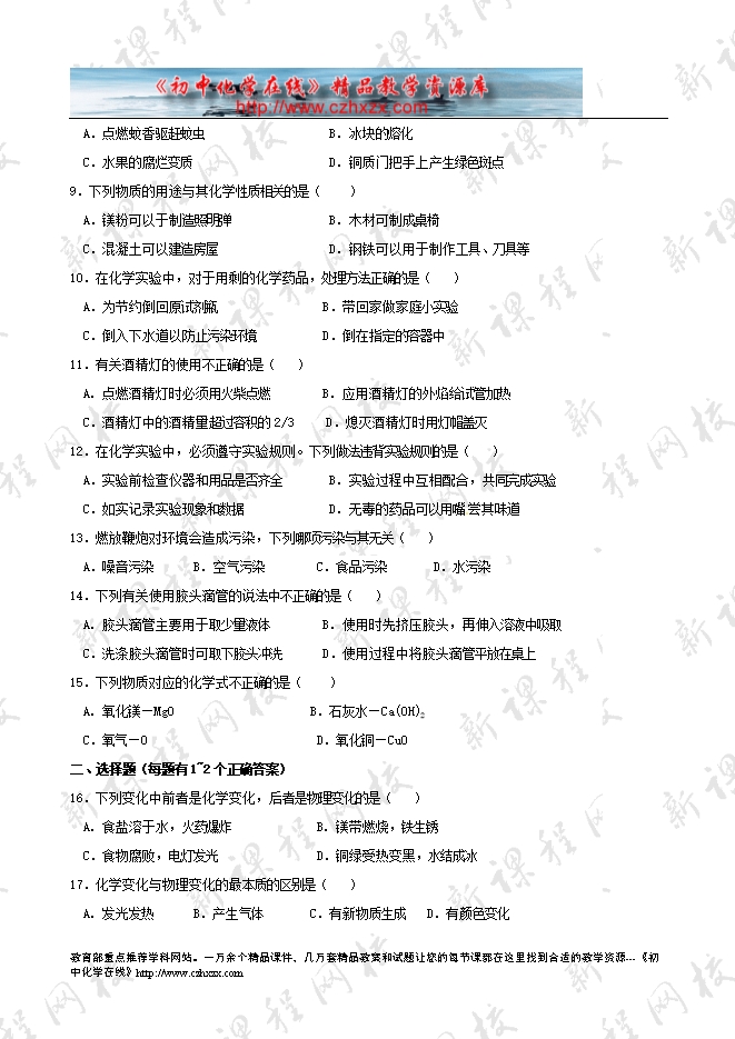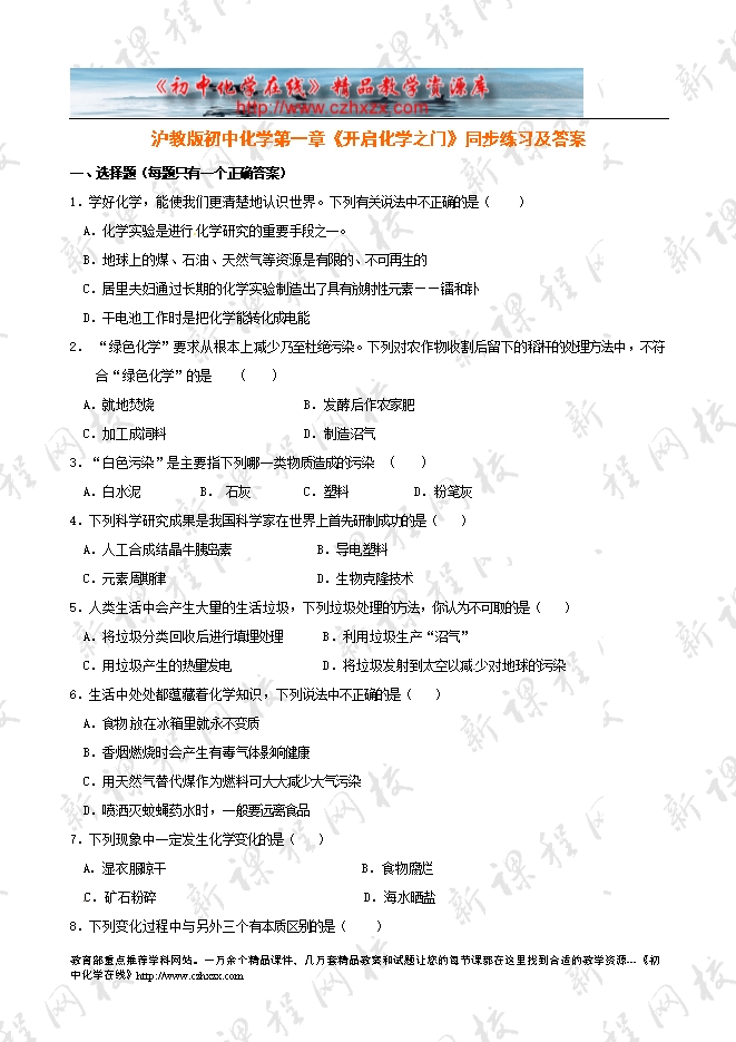 沪教版初中化学第一章《开启化学之门》同步练习及答案
