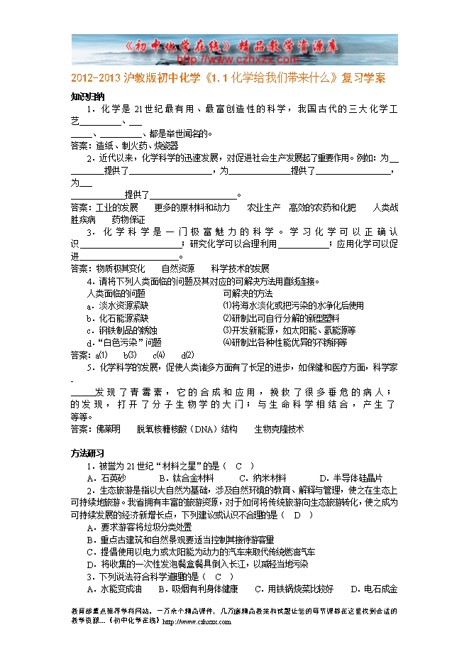 2012-2013沪教版初中化学《1.1化学给我们带来什么》复习学案