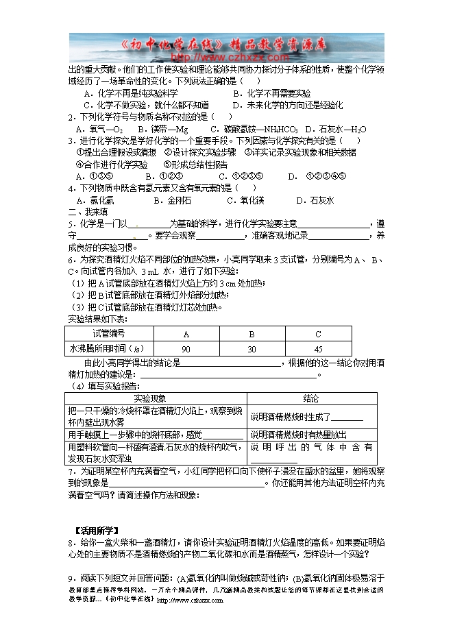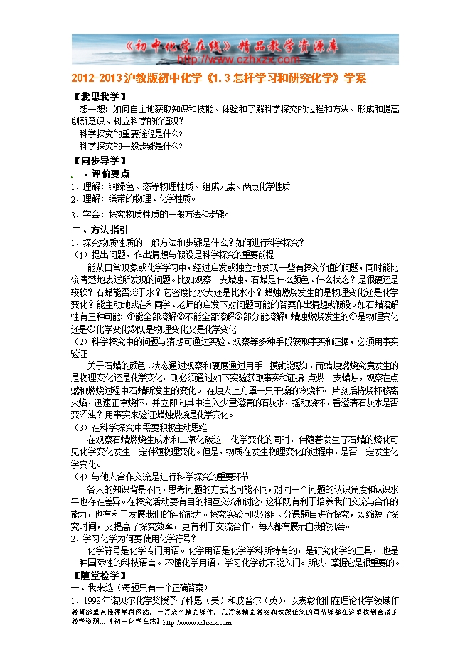 2012-2013沪教版初中化学《1.3怎样学习和研究化学》学案