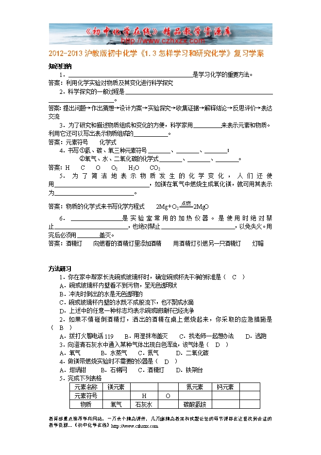 2012-2013沪教版初中化学《1.3怎样学习和研究化学》复习学案
