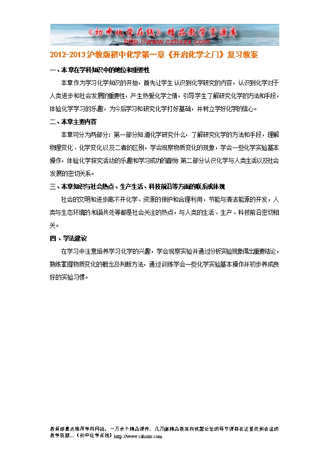 2012-2013沪教版初中化学第一章《开启化学之门》复习教案