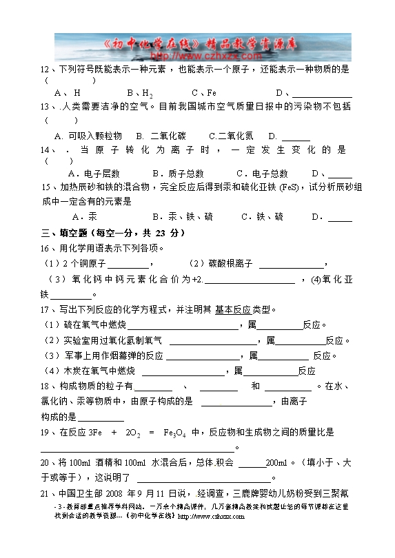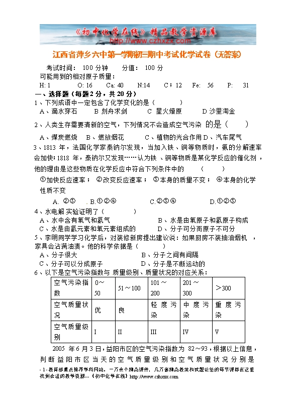 江西省萍乡六中第一学期初三期中考试化学试卷(无答案)