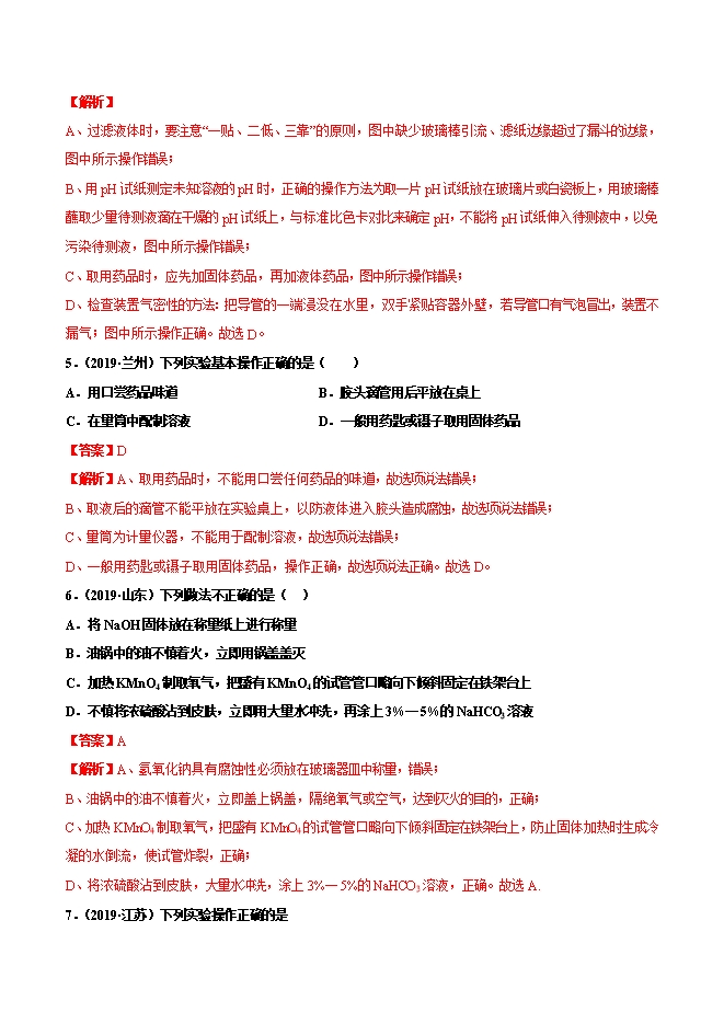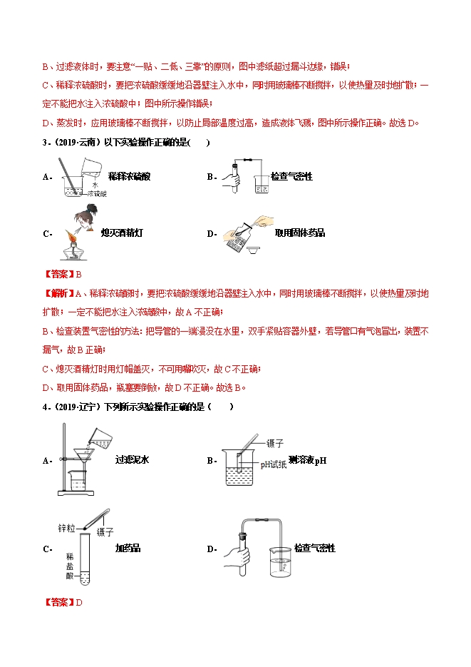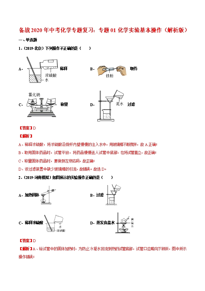 【内容简介】1.(2019•北京)下列操作不正确的是( )A. 稀释B. 取药C. 称量D. 过滤【答案】D【解析】A、稀释浓硫酸,将浓硫酸沿烧杯内壁慢慢的注入水中,用玻璃棒不断搅拌,故A正确;B、取用固体药品时,试管平放,将药品慢慢送人试管中底部,在将试管直立,故正确;C、称量固体药品时,要做到左物右码,故正确;D、该过滤装置中缺少玻璃棒的引流,故错误。故选D。2.(2019•河南模拟)如图所示的实验操作正确的是( )A.加热固体 B.过滤 C.稀释浓硫酸 D.蒸发食盐水 【答案】D【解析】A、给试管中的固体加热时,为防止冷凝水回流到热的试管底部,试管口应略向下倾斜,图中所示操作错误;B、过滤液体时,要注意“一贴、二低、三靠”的原则,图中滤纸超过漏斗边缘,错误;C、稀释浓硫酸时,要把浓硫酸缓缓地沿器壁注入水中,同时用玻璃棒不断搅拌,以使热量及时地扩散;一定不能把水注入浓硫酸中;图中所示操作错误;D、蒸发时,应用玻璃棒不断搅拌,以防止局部温度过高,造成液体飞溅,图中所示操作正确。故选D。3.(2019•云南)以下实验操作正确的是( )A. 稀释浓硫酸B. 检查气密性C. 熄灭酒精灯D. 取用固体药品【答案】B【解析】A、稀释浓硫酸时,要把浓硫酸缓缓地沿器壁注入水中,同时用玻璃棒不断搅拌,以使热量及时地扩散;一定不能把水注入浓硫酸中,故A不正确;B、检查装置气密性的方法:把导管的一端浸没在水里,双手紧贴容器外壁,若导管口有气泡冒出,装置不漏气,故B正确;