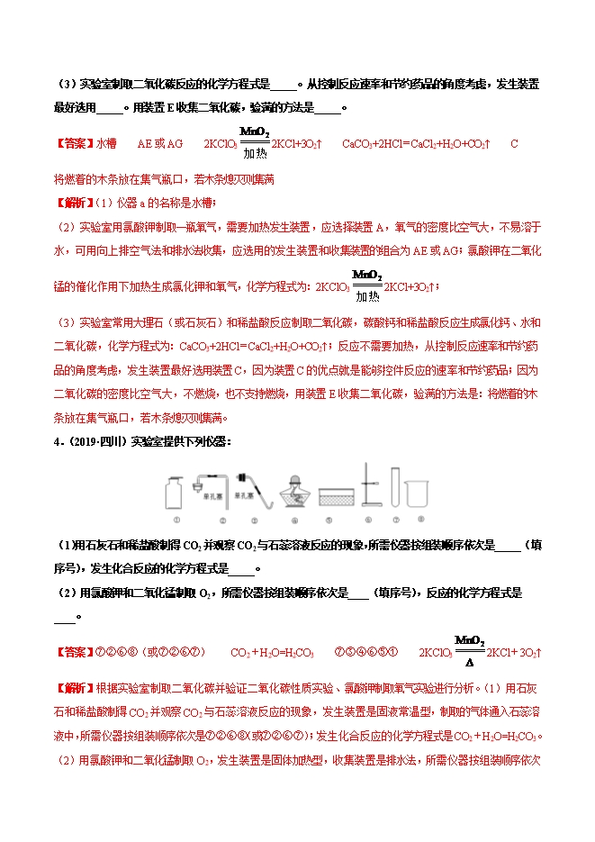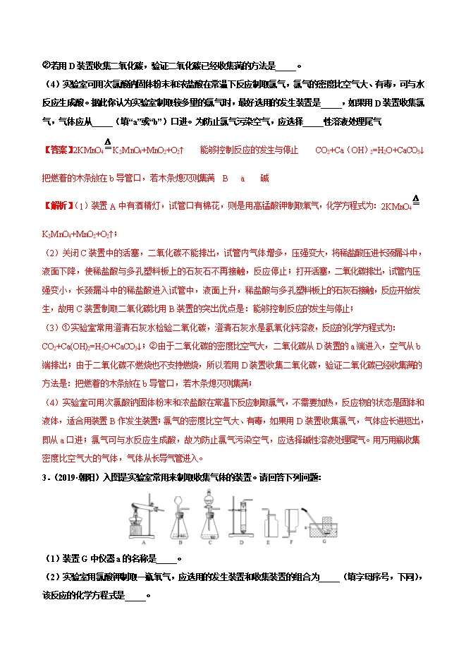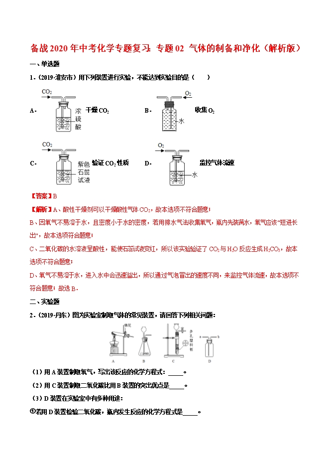 【内容简介】1.(2019•淮安市)用下列装置进行实验,不能达到实验目的是( )A. 干燥CO2B. 收集O2C. 验证CO2性质D. 监控气体流速【答案】B【解析】A、酸性干燥剂可以干燥酸性气体CO2,故本选项不符合题意;B、因氧气不易溶于水,且密度小于水的密度,若用排水气法收集氧气,瓶内先装满水,氧气应该“短进长出”,故本选项符合题意;C、二氧化碳的水溶液呈酸性,能使石蕊试液变红,所以该实验验证了CO2与H2O反应生成H2CO3,故本选项不符合题意;D、氧气不易溶于水,进入水中会迅速溢出,所以通过气泡冒出的速度不同,来监控气体流速,故本选项不符合题意;故选B.二、实验题2.(2019•丹东)图为实验室制取气体的常见装置,请回答下列相关问题: (1)用A装置制取氧气,写出该反应的化学方程式:_____。(2)用C装置制取二氧化碳比用B装置的突出优点是_____。