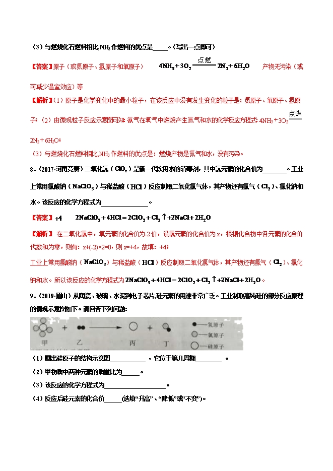 【内容简介】如图所示的是某化学反应的微观示意图,其中 表示氢原子, 表示氧原子 表示碳原子.根据图中的信息判断,下列说法不正确的是A.以上反应符合质量守恒定律B.化学反应前后原子的种类不变C.物质 X 的化学式为 H2OD.两种生成物之间的质量比为 22:9【答案】D【解析】A、该反应属于化学变化,化学反应遵循质量守恒定律,不符合题意;B、在化学反应中,反应前后原子的种类没有变化,不符合题意;C、根据质量守恒定律,反应前后,原子的种类和数目不变,2X中应含有4个氢原子和2个氧原子,则每个X分子由2个氢原子和1个氧原子组成,则物质 X 的化学式为 H2O,不符合题意;D、由微观示意图可知,该反应的生成物是CO2和H2O,CO2和H2O的分子个数比为1:2,则两种生成物之间的质量比为44:18×2=11:9,符合题意。故选D。......