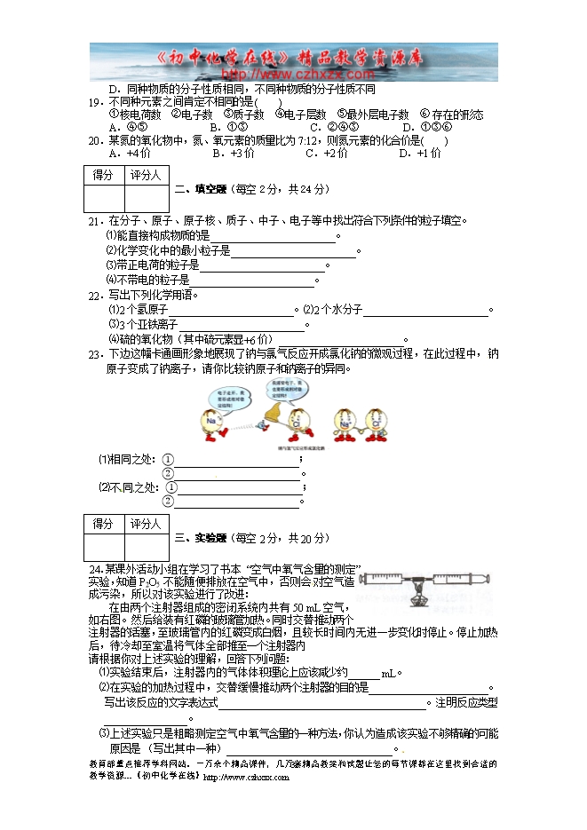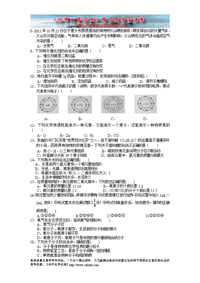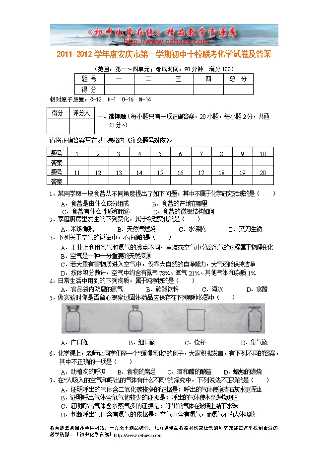 2011-2012学年度安徽省安庆市第一学期初中十校联考化学试卷及答案