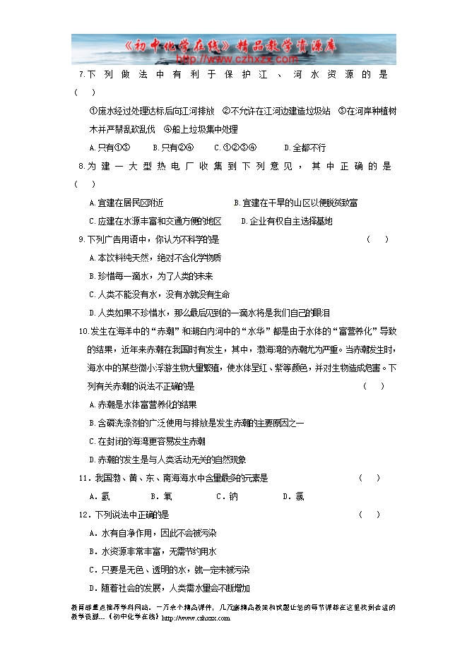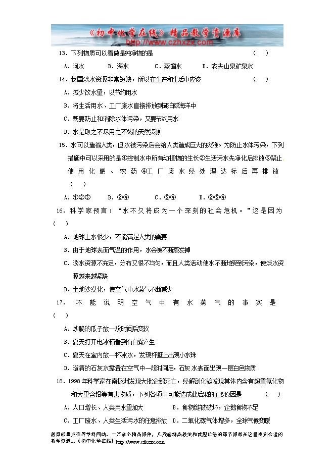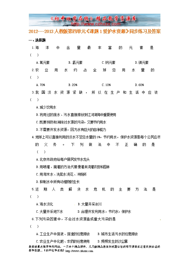2012---2013人教版第四单元《课题1 爱护水资源》同步练习及答案