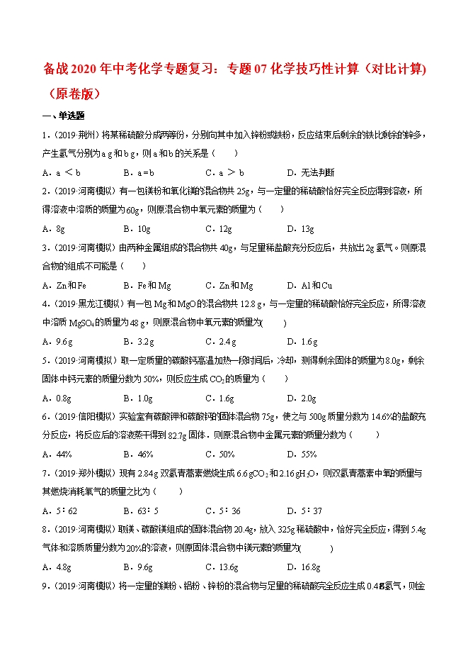 备战2020年中考化学专题复习:专题07化学技巧性计算(对比计算)(原卷版)