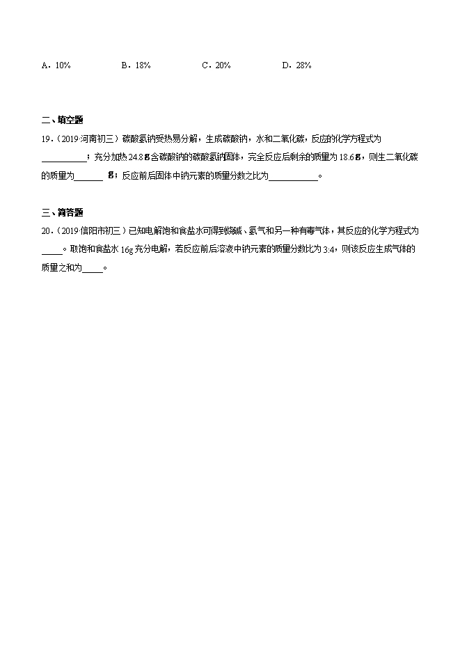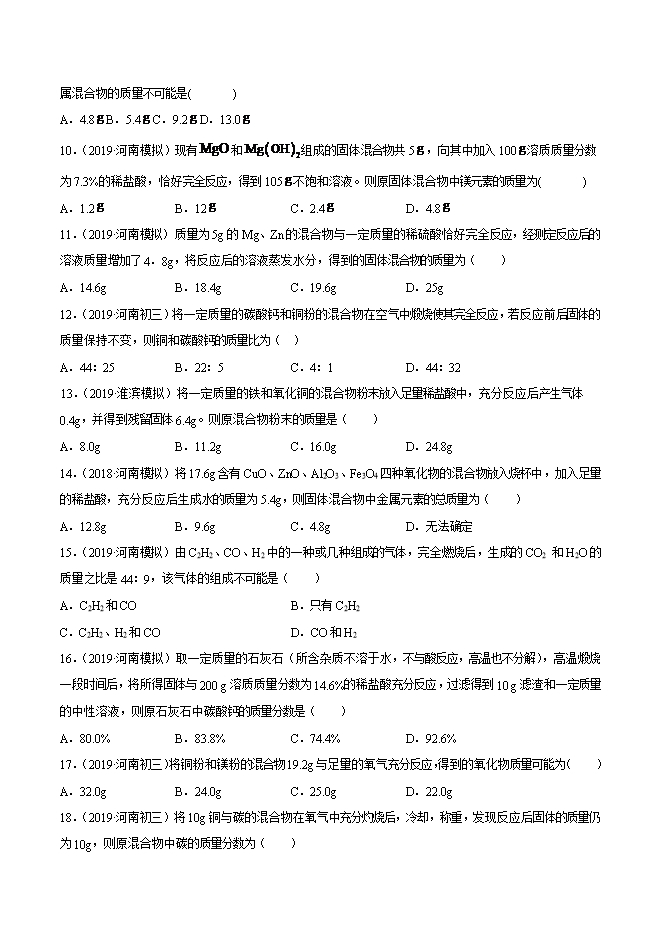 【内容简介】由两种金属组成的混合物共40g,与足量稀盐酸充分反应后,共放出2g氢气。则原混合物的组成不可能是( )A.Zn和FeB.Fe和MgC.Zn和MgD.Al和Cu4.(2019•黑龙江模拟)有一包Mg和MgO的混合物共12.8 g,与一定量的稀硫酸恰好完全反应,所得溶液中溶质MgSO4的质量为48 g,则原混合物中氧元素的质量为( )A.9.6 gB.3.2 gC.2.4 gD.1.6 g5.(2019•河南模拟)取一定质量的碳酸钙高温加热一段时间后,冷却,测得剩余固体的质量为8.0g,剩余固体中钙元素的质量分数为50%,则反应生成CO2的质量为( )A.0.8gB.1.0gC.1.6gD.2.0g6.(2019•信阳模拟)实验室有碳酸钾和碳酸钙的固体混合物75g,使之与500g质量分数为14.6%的盐酸充分反应,将反应后的溶液蒸干得到82.7g固体.则原混合物中金属元素的质量分数为( )A.44%B.46%C.50%D.55%......