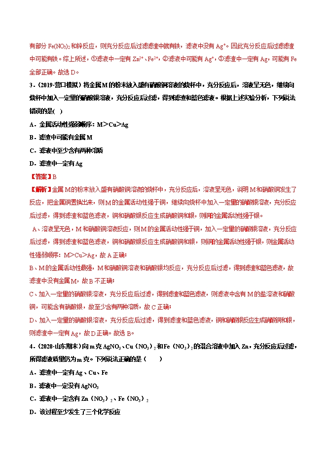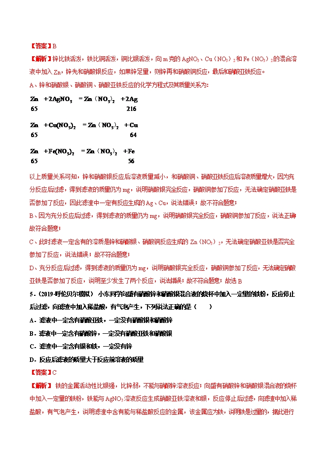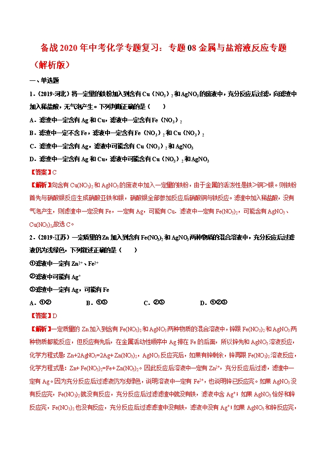 【内容简介】1.(2019•河北)将一定量的铁粉加入到含有Cu(NO3)2和AgNO3的废液中,充分反应后过滤,向滤渣中加入稀盐酸,无气泡产生。下列判断正确的是( )A.滤渣中一定含有Ag和Cu,滤液中一定含有Fe(NO3)2B.滤渣中一定不含Fe,滤液中一定含有Fe(NO3)2和Cu(NO3)2C.滤渣中一定含有Ag,滤液中可能含有Cu(NO3)2和AgNO3D.滤渣中一定含有Ag和Cu,滤液中可能含有Cu(NO3)2和AgNO3【答案】C【解析】向含有Cu(NO3)2和AgNO3的废液中加入一定量的铁粉,由于金属的活泼性是铁>铜>银。则铁粉首先与硝酸银反应生成硝酸亚铁和银,硝酸银全部参加反应后硝酸铜与铁反应。滤渣中加入稀盐酸,没有气泡产生,则滤渣中一定没有Fe,一定有Ag,可能有Cu.滤液中一定有Fe(NO3)2,可能含有AgNO3、Cu(NO3)2,故选C。2.(2019•江苏)一定质量的Zn加入到含有Fe(NO3)2和AgNO3两种物质的混合溶液中,充分反应后过滤液仍为浅绿色,下列叙述正确的是( )①滤液中一定有Zn2+、Fe2+②滤液中可能有Ag+③滤渣中一定有Ag,可能有Fe......