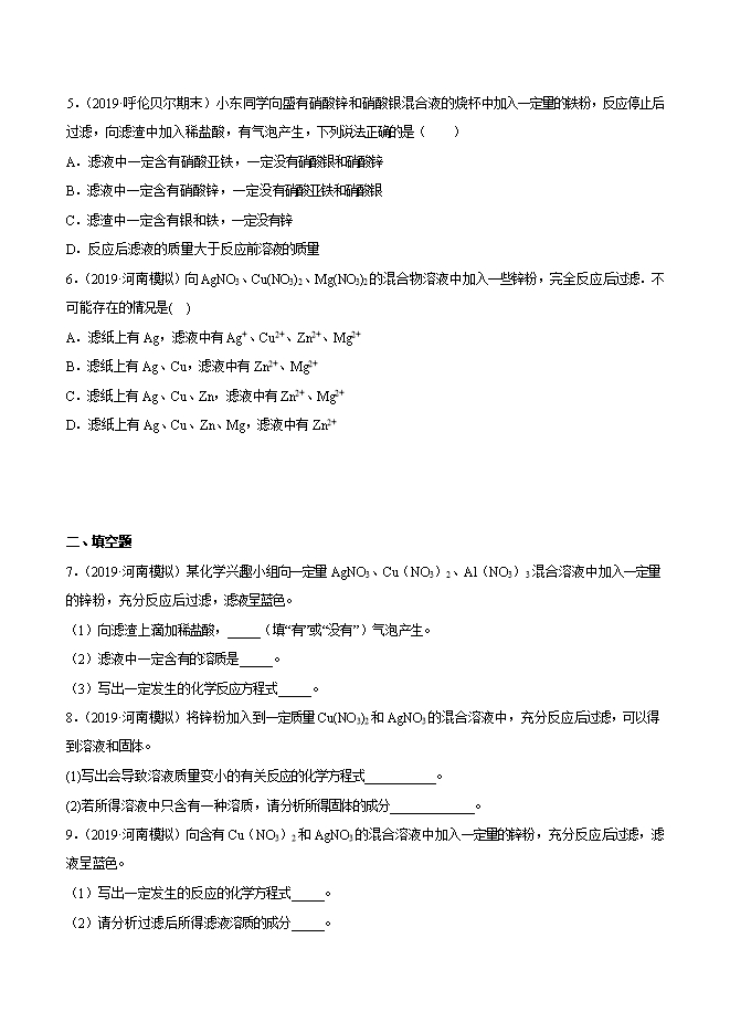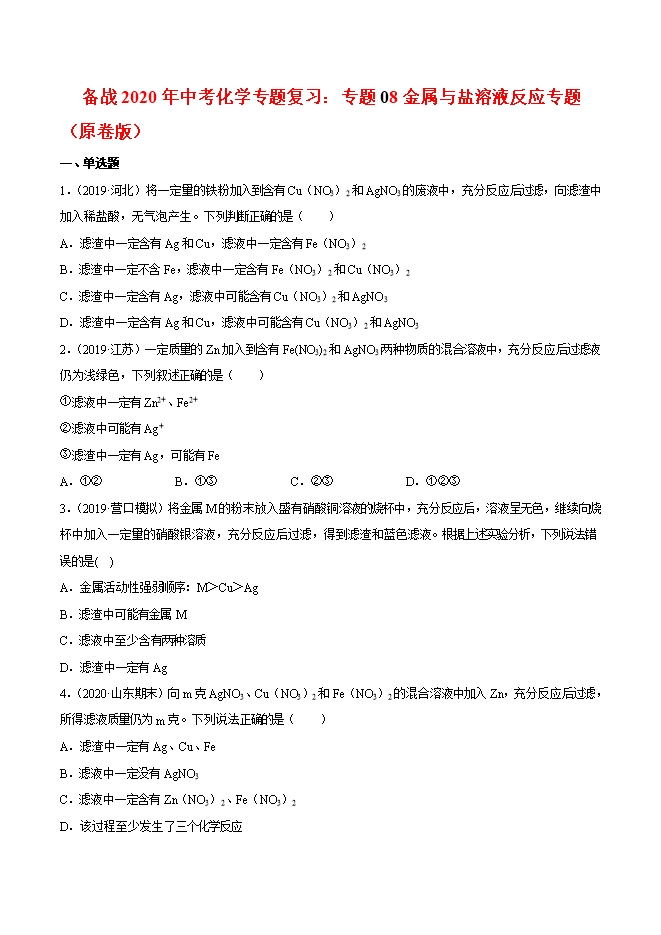 备战2020年中考化学专题复习:专题08金属与盐溶液反应专题(原卷版)