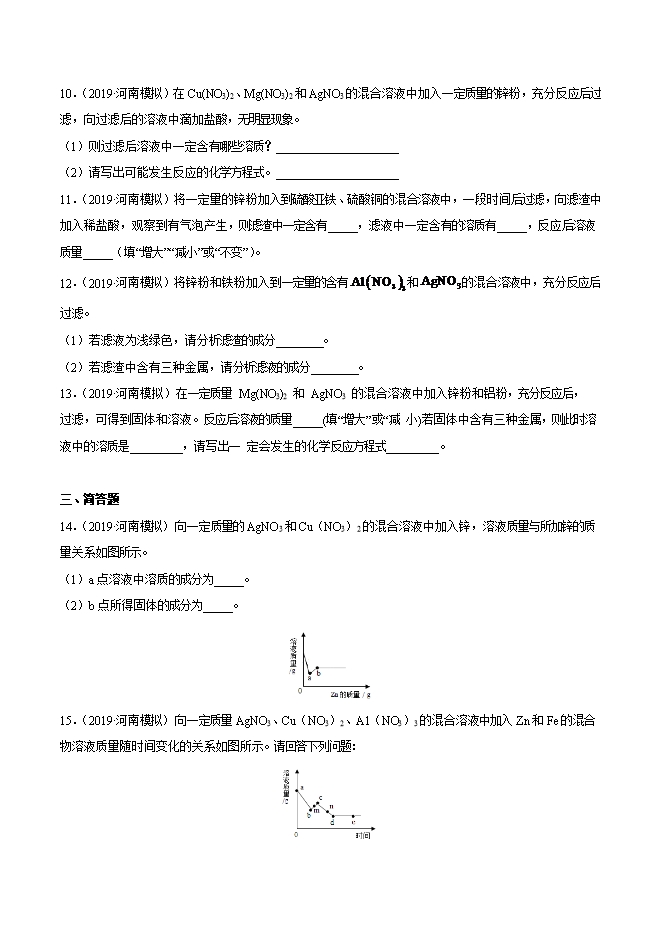 【内容简介】一、单选题将金属M的粉末放入盛有硝酸铜溶液的烧杯中,充分反应后,溶液呈无色,继续向烧杯中加入一定量的硝酸银溶液,充分反应后过滤,得到滤渣和蓝色滤液。根据上述实验分析,下列说法错误的是( )A.金属活动性强弱顺序:M>Cu>AgB.滤渣中可能有金属MC.滤液中至少含有两种溶质D.滤渣中一定有Ag4.(2020•山东期末)向m克AgNO3、Cu(NO3)2和Fe(NO3)2的混合溶液中加入Zn,充分反应后过滤,所得滤液质量仍为m克。下列说法正确的是( )A.滤渣中一定有Ag、Cu、FeB.滤液中一定没有AgNO3C.滤液中一定含有Zn(NO3)2、Fe(NO3)2D.该过程至少发生了三个化学反应......