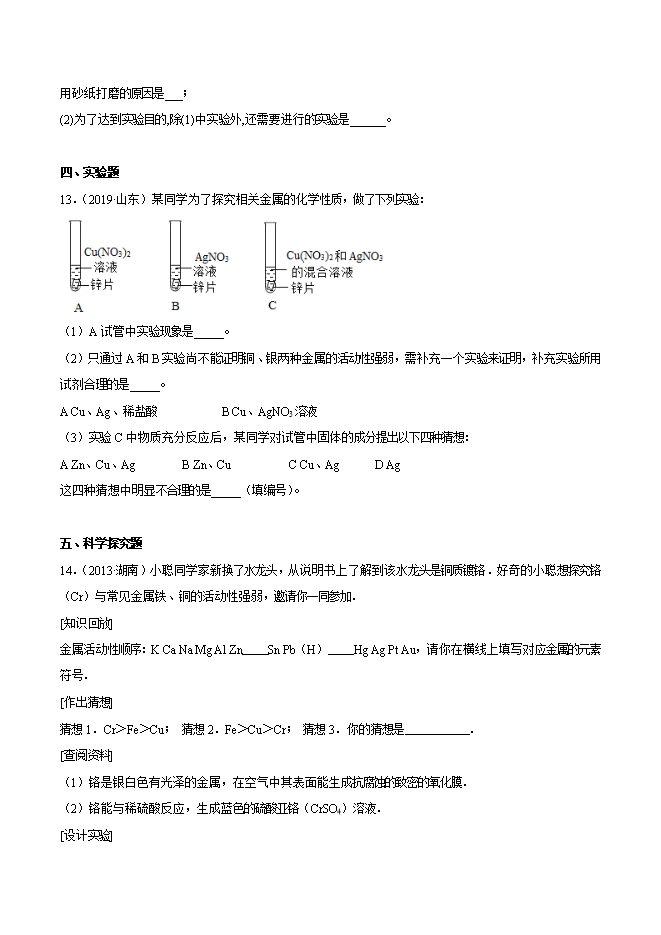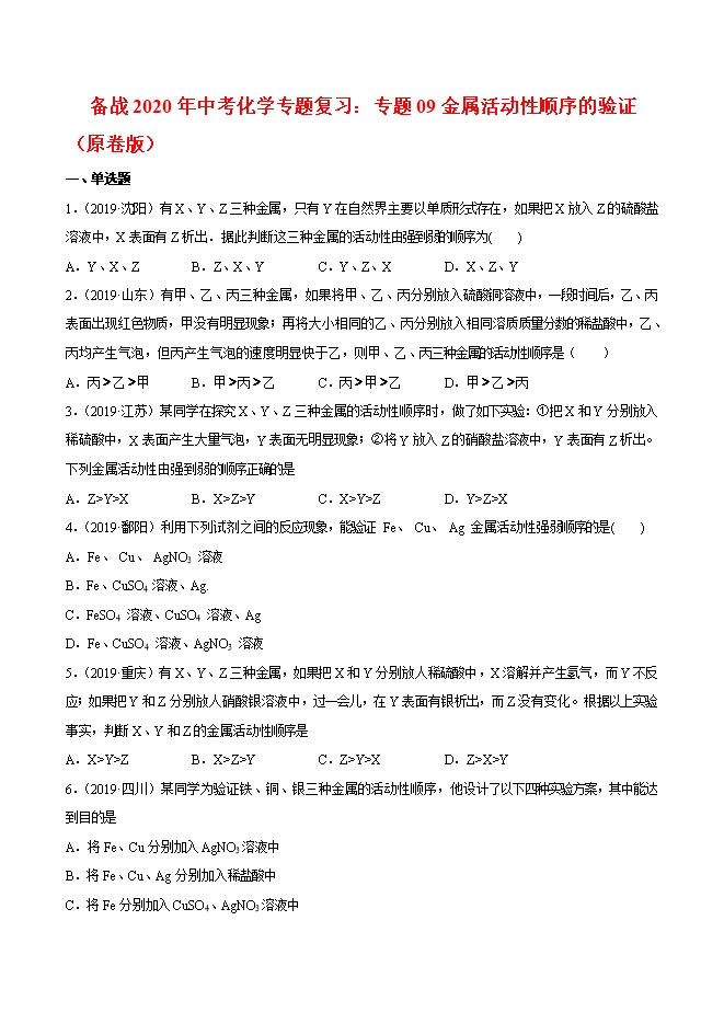 备战2020年中考化学专题复习:专题09金属活动性顺序的验证(原卷版)