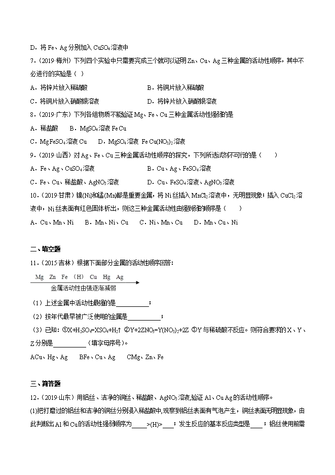 【内容简介】某同学在探究X、Y、Z三种金属的活动性顺序时,做了如下实验:①把X和Y分别放入稀硫酸中,X表面产生大量气泡,Y表面无明显现象;②将Y放入Z的硝酸盐溶液中,Y表面有Z析出。下列金属活动性由强到弱的顺序正确的是A.Z>Y>XB.X>Z>YC.X>Y>ZD.Y>Z>X4.(2019•鄱阳)利用下列试剂之间的反应现象,能验证 Fe、 Cu、 Ag 金属活动性强弱顺序的是( )A.Fe、 Cu、 AgNO3 溶液B.Fe、CuSO4 溶液、Ag.C.FeSO4 溶液、CuSO4 溶液、AgD.Fe、CuSO4 溶液、AgNO3 溶液5.(2019•重庆)有X、Y、Z三种金属,如果把X和Y分别放人稀硫酸中,X溶解并产生氢气,而Y不反应;如果把Y和Z分别放人硝酸银溶液中,过一会儿,在Y表面有银析出,而Z没有变化。根据以上实验事实,判断X、Y和Z的金属活动性顺序是A.X>Y>ZB.X>Z>YC.Z>Y>XD.Z>X>Y......
