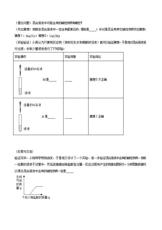 【内容简介】某校化学兴趣小组的同学在探究碱的化学性质时,完成了如下图所示的两个实验。 (1)A实验中观察到的现象是_____(2)B实验中发生反应的化学方程式为_____实验完毕后,小亮同学在整理仪器时,将上述实验后的废液倒入同一个洁净的成液缸中,发现混合后的废液仍然浑浊并显红色,于是引起了他的质疑和探究兴趣。(提出问题)混合废液中可能含有的碱性物质有哪些?(作出猜想)他断定混合废液中一定含有氢氧化钠,理由是_____;并对是否含有其它碱性物质作出猜想:猜想Ⅰ:〖"Na" 〗_"2" 〖"CO" 〗_"3" ;猜想Ⅱ:〖"Ca(OH)" 〗_"2" (实验验证)小亮认为只要用反应物(饱和石灰水和碳酸钠溶液)就可以验证猜想。于是他对混合废液进行过滤,并取少量滤液进行了下列实验:......