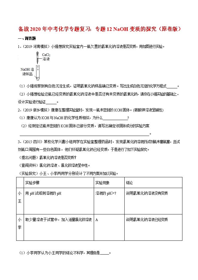 备战2020年中考化学专题复习:专题12 NaOH变质的探究(原卷版)