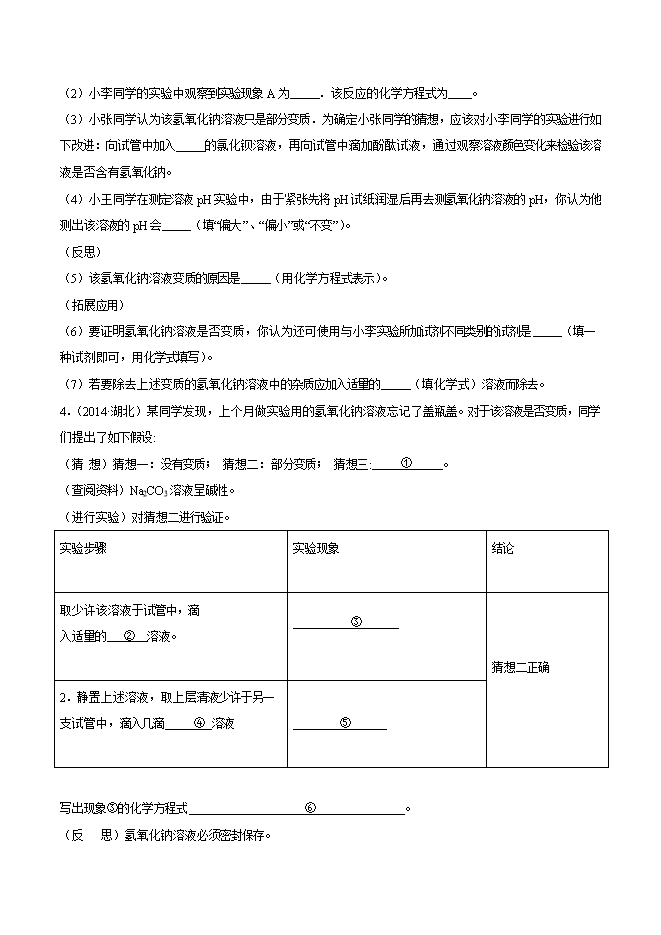 【内容简介】小强想探究实验室内一瓶久置的氢氧化钠溶液是否变质,用如图进行实验。 (1)小强观察到有白色沉淀生成,证明氢氧化钠样品确已变质。写出生成白色沉淀的化学方程式______。(2)小强想检验这瓶已经变质的氢氧化钠溶液中是否还有未变质的氢氧化钠,请你在小强实验的基础上,设计实验进行验证______。2.(2019•新乡模拟)康康在整理实验室时,发现一瓶未密封的KOH固体。(碳酸钾溶液呈碱性)(1)康康认为KOH与NaOH的化学性质相似,为什么______________?(2)经测定这瓶未密封的KOH固体已部分变质,请写出确定该固体成分的实验方案__________________________________________________________________________。3.(2015•四川)某校化学兴趣小组同学在实验室整理药品时,发现氢氧化钠溶液的试剂瓶未塞瓶塞,且试剂瓶口周围有一些白色固体,他们怀疑氢氧化钠已经变质,于是进行了如下实验探究。(提出问题)氢氧化钠溶液是否变质?(查阅资料)氯化钠溶液、氯化钡溶液呈中性。(实验探究)小王、小李两同学分别设计了不同方案并加以实验。......
