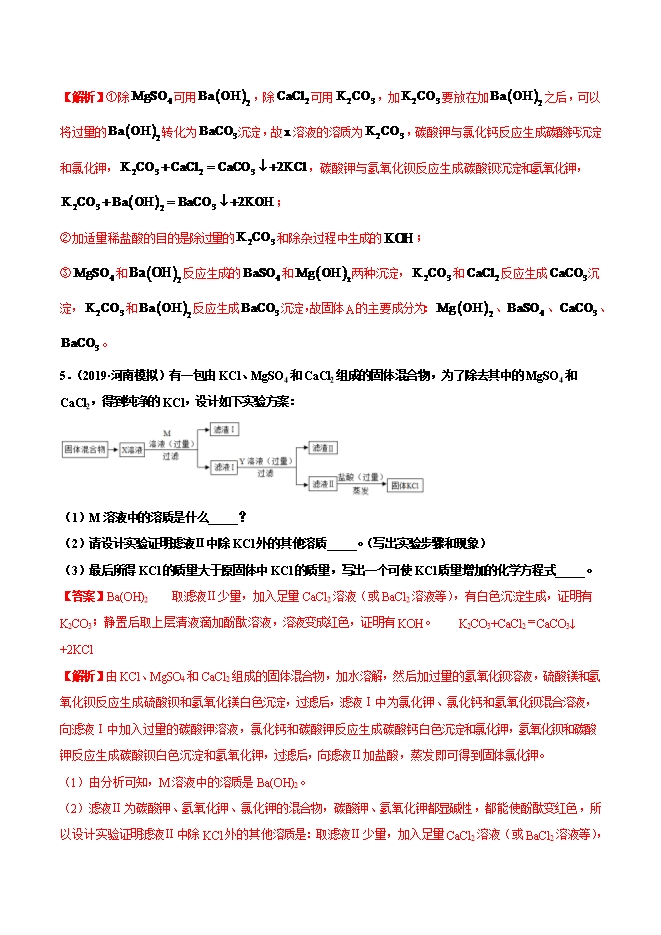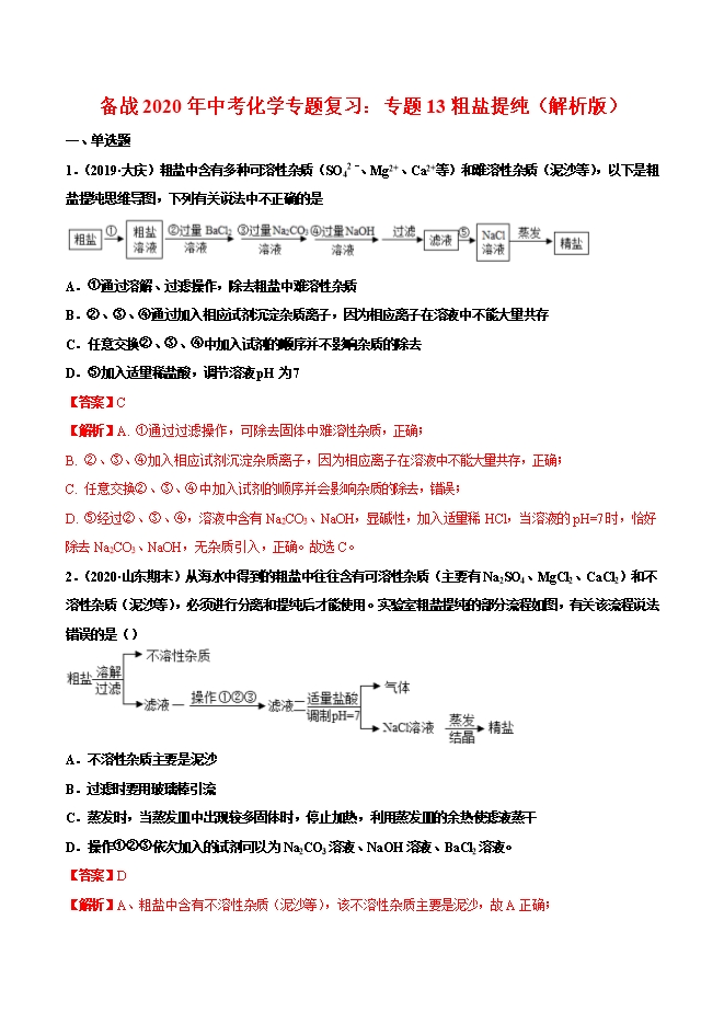 【内容简介】粗盐中含有多种可溶性杂质(SO42﹣、Mg2+、Ca2+等)和难溶性杂质(泥沙等),以下是粗盐提纯思维导图,下列有关说法中不正确的是 A.①通过溶解、过滤操作,除去粗盐中难溶性杂质B.②、③、④通过加入相应试剂沉淀杂质离子,因为相应离子在溶液中不能大量共存C.任意交换②、③、④中加入试剂的顺序并不影响杂质的除去D.⑤加入适量稀盐酸,调节溶液pH为7【答案】C【解析】A. ①通过过滤操作,可除去固体中难溶性杂质,正确;B. ②、③、④加入相应试剂沉淀杂质离子,因为相应离子在溶液中不能大量共存,正确;C. 任意交换②、③、④中加入试剂的顺序并会影响杂质的除去,错误;D. ⑤经过②、③、④,溶液中含有Na2CO3、NaOH,显碱性,加入适量稀HCl,当溶液的pH=7时,恰好除去Na2CO3、NaOH,无杂质引入,正确。故选C。2.(2020•山东期末)从海水中得到的粗盐中往往含有可溶性杂质(主要有Na2SO4、MgCl2、CaCl2)和不溶性杂质(泥沙等),必须进行分离和提纯后才能使用。实验室粗盐提纯的部分流程如图,有关该流程说法错误的是()......