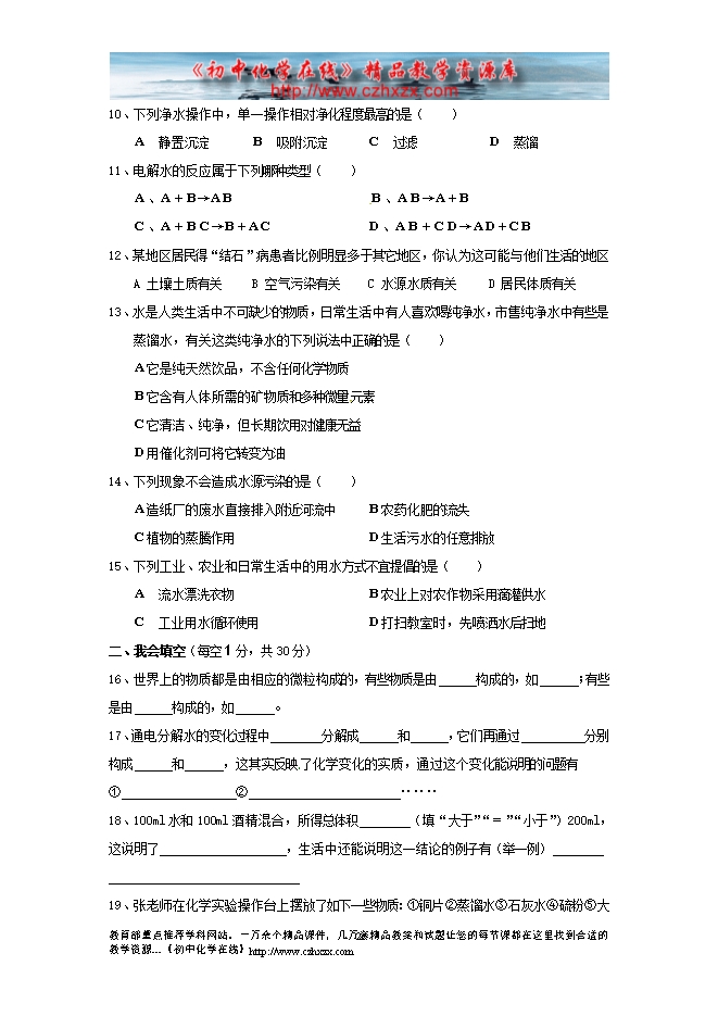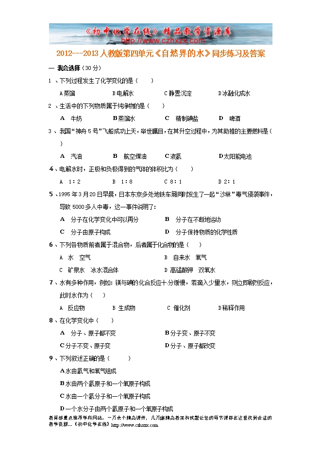 2012---2013人教版第四单元《自然界的水》同步练习及答案