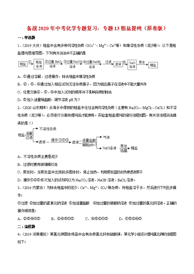 备战2020年中考化学专题复习:专题13粗盐提纯(原卷版)