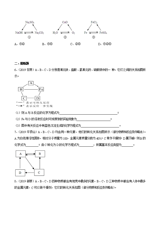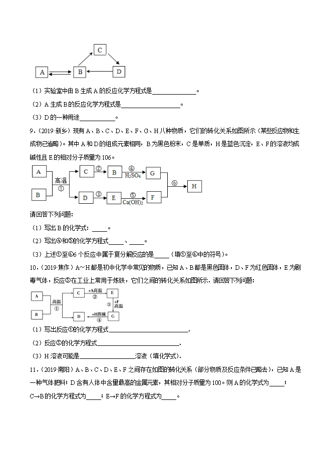 【内容简介】A、B、C、D分别是氧化铁、盐酸、氢氧化钠、硫酸铜中的一 种,它们之间的关系如图所示。 (1)则A与B反应的化学方程式为_________________________________________;(2)Fe与D的溶液反应时可观察到的实验现象为________________________;(3)图中有关反应中有蓝色沉淀生成的化学方程式为___________________________。7.(2019•平顶山)A、B、C、D均含同一种元素,他们的转化关系如图所示(部分物质和反应条件略去)。A为白色难溶性固体,相对分子质量为100,金属元素质量分数为40%;C常作干燥剂;D属于碱;则B的化学式为_________;由C转化为D的化学方程式为__________,所属基本反应类型为________。 8.(2019•新蔡)A、B、C、D四种物质都含有地壳中最多的元素,B、C、D三种物质中都含有人体中最多的金属元素,C可以做干燥剂,它们的转化关系如图(部分物质和反应条件略去)。......