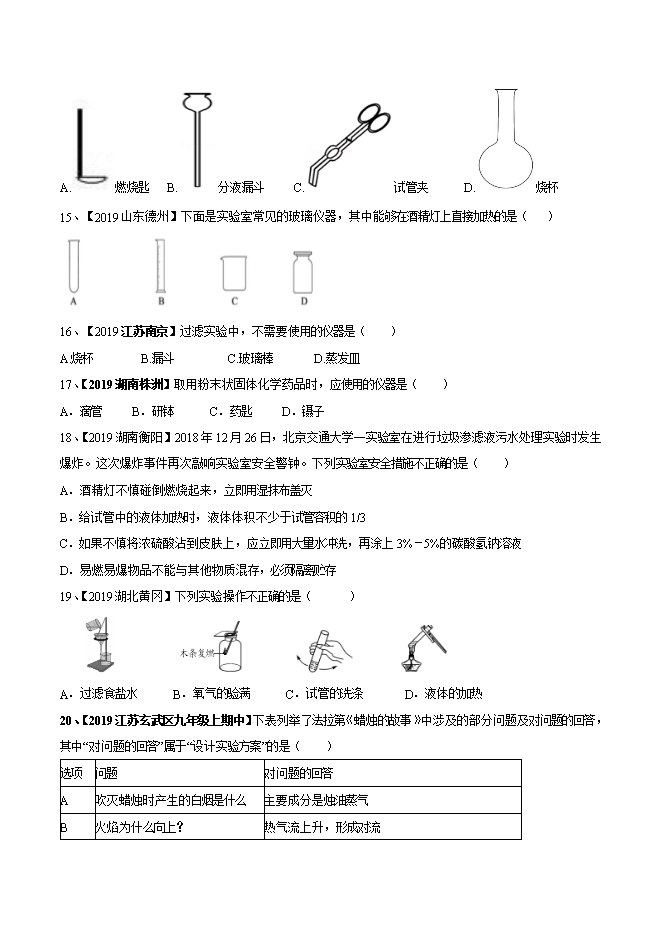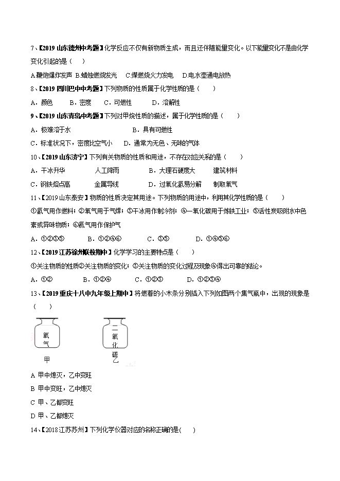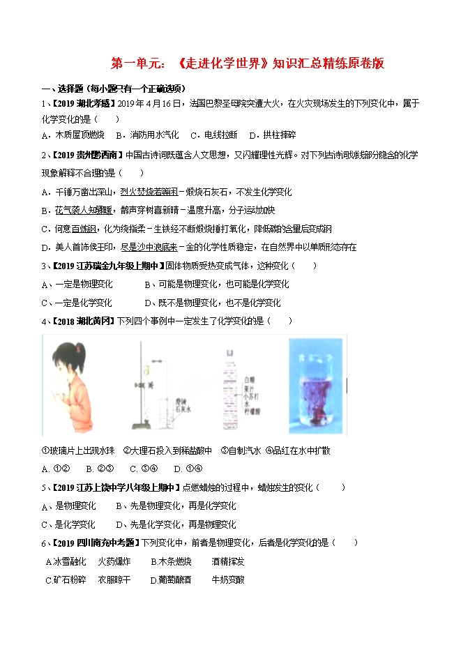 【内容简介】1、【2019湖北孝感】2019年4月16日,法国巴黎圣母院突遭大火,在火灾现场发生的下列变化中,属于化学变化的是( )A.木质屋顶燃烧 B.消防用水汽化 C.电线拉断 D.拱柱摔碎2、【2019贵州黔西南】中国古诗词既蕴含人文思想,又闪耀理性光辉。对下列古诗词划线部分隐含的化学现象解释不合理的是( )A.千锤万凿出深山,烈火焚烧若等闲﹣煅烧石灰石,不发生化学变化B.花气袭人知骤暖,鹊声穿树喜新晴﹣温度升高,分子运动加快C.何意百炼钢,化为绕指柔﹣生铁经不断煅烧捶打氧化,降低碳的含量后变成钢D.美人首饰侯王印,尽是沙中浪底来﹣金的化学性质稳定,在自然界中以单质形态存在3、【2019江苏瑞金九年级上期中】固体物质受热变成气体,这种变化( )A、一定是物理变化 B、可能是物理变化,也可能是化学变化C、一定是化学变化 D、既不是物理变化,也不是化学变化4、【2018湖北黄冈】下列四个事例中一定发生了化学变化的是( ) ①玻璃片上出现水珠 ②大理石投入到稀盐酸中 ③自制汽水 ④品红在水中扩散A. ①② B. ②③ C. ③④ D. ①④5、【2019江苏上饶中学八年级上期中】点燃蜡烛的过程中,蜡烛发生的变化( )A、是物理变化 B、先是物理变化,再是化学变化 C、是化学变化 D、先是化学变化,再是物理变化6、【2019四川南充中考题】下列变化中,前者是物理变化,后者是化学变化的是( )......