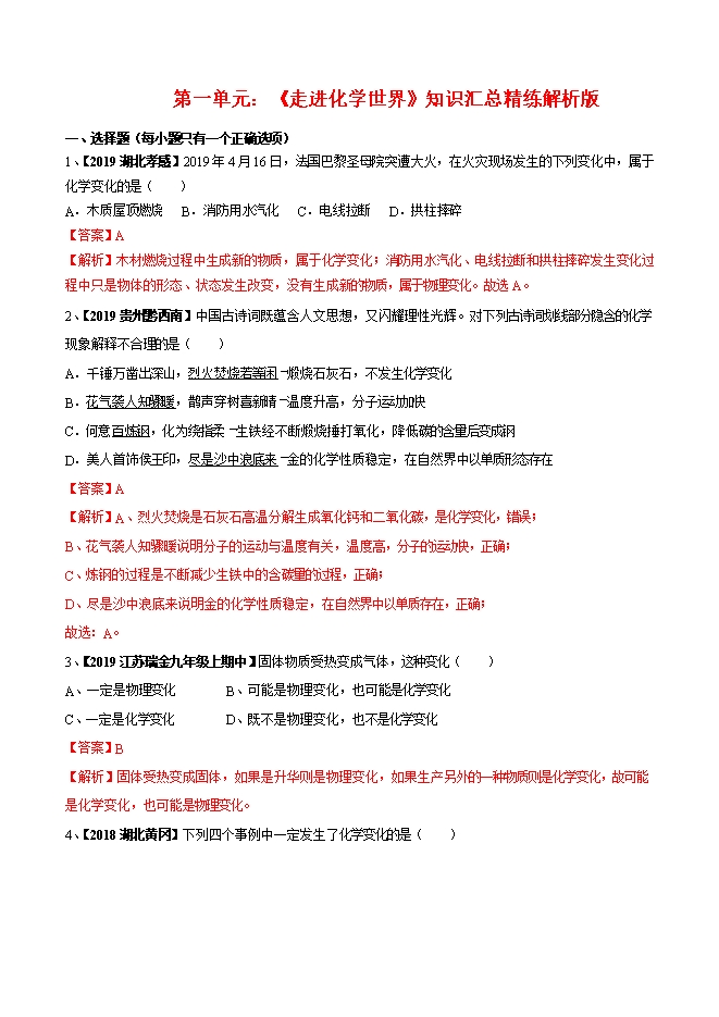 【内容简介】2019年4月16日,法国巴黎圣母院突遭大火,在火灾现场发生的下列变化中,属于化学变化的是( )A.木质屋顶燃烧 B.消防用水汽化 C.电线拉断 D.拱柱摔碎【答案】A【解析】木材燃烧过程中生成新的物质,属于化学变化;消防用水汽化、电线拉断和拱柱摔碎发生变化过程中只是物体的形态、状态发生改变,没有生成新的物质,属于物理变化。故选A。2、【2019贵州黔西南】中国古诗词既蕴含人文思想,又闪耀理性光辉。对下列古诗词划线部分隐含的化学现象解释不合理的是( )A.千锤万凿出深山,烈火焚烧若等闲﹣煅烧石灰石,不发生化学变化B.花气袭人知骤暖,鹊声穿树喜新晴﹣温度升高,分子运动加快C.何意百炼钢,化为绕指柔﹣生铁经不断煅烧捶打氧化,降低碳的含量后变成钢D.美人首饰侯王印,尽是沙中浪底来﹣金的化学性质稳定,在自然界中以单质形态存在【答案】A【解析】A、烈火焚烧是石灰石高温分解生成氧化钙和二氧化碳,是化学变化,错误;B、花气袭人知骤暖说明分子的运动与温度有关,温度高,分子的运动快,正确;C、炼钢的过程是不断减少生铁中的含碳量的过程,正确;D、尽是沙中浪底来说明金的化学性质稳定,在自然界中以单质存在,正确;故选:A。3、【2019江苏瑞金九年级上期中】固体物质受热变成气体,这种变化( )A、一定是物理变化 B、可能是物理变化,也可能是化学变化C、一定是化学变化 D、既不是物理变化,也不是化学变化【答案】B【解析】固体受热变成固体,如果是升华则是物理变化,如果生产另外的一种物质则是化学变化,故可能是化学变化,也可能是物理变化。........