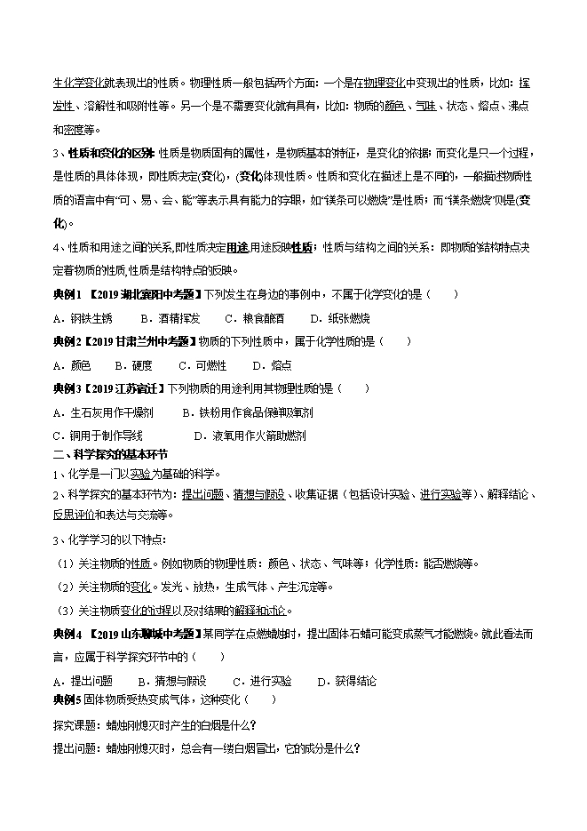 【内容简介】化学性质是指在化学变化中表现出的性质。比如:可燃性、还原性和酸碱性等。物理性质是指不需要发生化学变化就表现出的性质。物理性质一般包括两个方面:一个是在物理变化中变现出的性质,比如:挥发性、溶解性和吸附性等。另一个是不需要变化就有具有,比如:物质的颜色、气味、状态、熔点、沸点和密度等。3、性质和变化的区别:性质是物质固有的属性,是物质基本的特征,是变化的依据;而变化是只一个过程,是性质的具体体现,即性质决定(变化),(变化)体现性质。性质和变化在描述上是不同的,一般描述物质性质的语言中有“可、易、会、能”等表示具有能力的字眼,如“镁条可以燃烧”是性质;而“镁条燃烧”则是(变化)。4、性质和用途之间的关系,即性质决定用途,用途反映性质;性质与结构之间的关系:即物质的结构特点决定着物质的性质,性质是结构特点的反映。典例1 【2019湖北襄阳中考题】下列发生在身边的事例中,不属于化学变化的是( )A.钢铁生锈 B.酒精挥发 C.粮食酿酒 D.纸张燃烧典例2【2019甘肃兰州中考题】物质的下列性质中,属于化学性质的是( )A.颜色 B.硬度 C.可燃性 D.熔点典例3【2019江苏宿迁】下列物质的用途利用其物理性质的是( )A.生石灰用作干燥剂 B.铁粉用作食品保鲜吸氧剂C.铜用于制作导线 D.液氧用作火箭助燃剂......