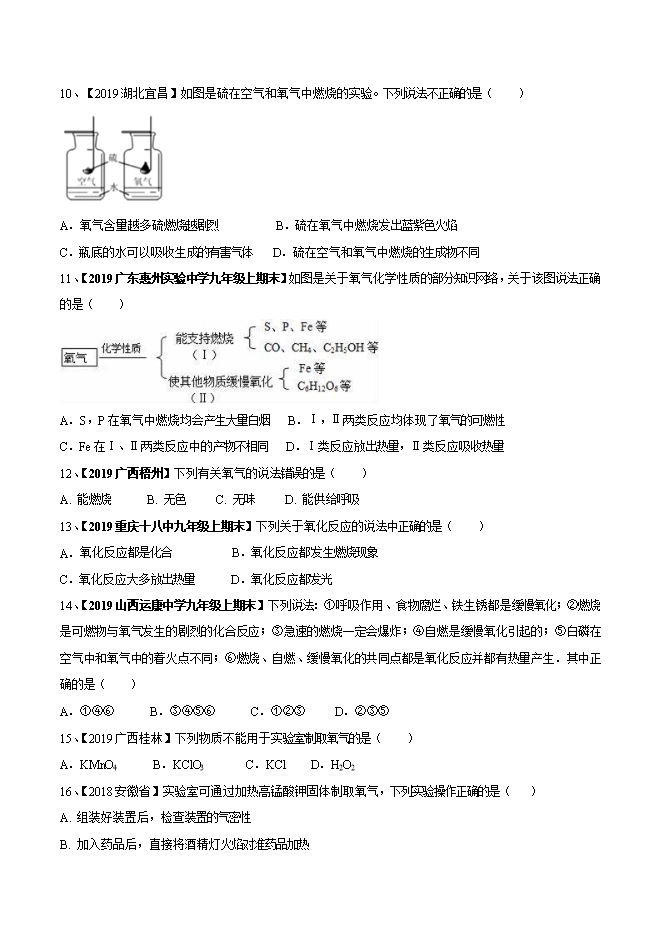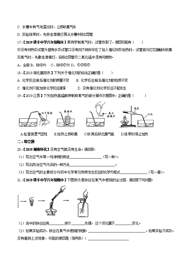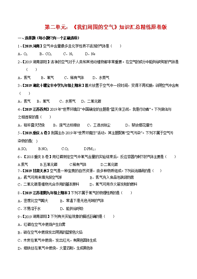 【内容简介】 空气中含量最多且化学性质不活泼的气体是( )A.O2 B.CO2 C.N2 D.Ne2、【2019湖南邵阳】洁净的空气对于人类和其他动植物都非常重要。在空气的成分中能供给呼吸的气体是( )A.氮气 B.氧气 C.稀有气体 D.水蒸气3、【2019湖北十堰宝丰中学九年级上期末】薯片放置于空气中一段时间,变得不再松脆,说明空气中含有( )A.氮气 B.氧气 C.水蒸气 D.二氧化碳4、【2019江苏苏州】2019年“世界环境日”中国确定的主题是“蓝天保卫战,我是行动者”。下列做法与之相违背的是( )A.秸秆露天焚烧 B.废气达标排放 C.工洒水除尘 D.禁放烟花爆竹5、【2019.重庆A卷】我国主办2019年“世界环境日”活动,其主题聚焦“空气污染”。下列不属于空气污染物的是( ) A.SO2 B.NO2 C.O2 D.PM2.56、【2018重庆B卷】用红磷测定空气中氧气含量的实验结束后,反应容器内剩下的气体主要是( )A.氮气 B.五氧化磷 C.稀有气体 D.二氧化碳7、【2019甘肃天水】空气是一种宝贵的自然资源,由多种物质组成。下列说法错误的是( )A.氦气可用来填充探空气球 B.氮气充入食品包装袋防腐C.二氧化碳是植物光合作用的基本原料 D.氧气可用作火箭发射的燃料......
