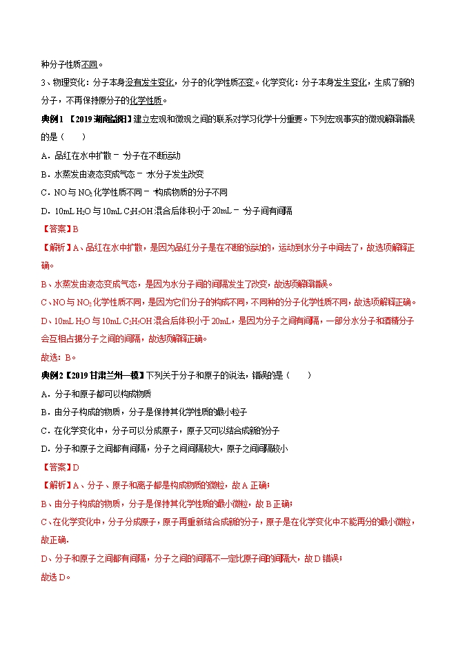 【内容简介】分子1、分子定义:分子是保持物质化学性质的最小粒子。分子是由原子构成的。2、分子性质:分子质量和体积都很小;分子总是在不断运动;分子之间有间隔;同种分子性质相同,不同种分子性质不同。3、物理变化:分子本身没有发生变化,分子的化学性质不变。化学变化:分子本身发生变化,生成了新的分子,不再保持原分子的化学性质。典例1 【2019湖南益阳】建立宏观和微观之间的联系对学习化学十分重要。下列宏观事实的微观解释错误的是( )A.品红在水中扩散﹣﹣分子在不断运动B.水蒸发由液态变成气态﹣﹣水分子发生改变C.NO与NO2化学性质不同﹣﹣构成物质的分子不同D.10mL H2O与10mL C2H5OH混合后体积小于20mL﹣﹣分子间有间隔【答案】B【解析】A、品红在水中扩散,是因为品红分子是在不断的运动的,运动到水分子中间去了,故选项解释正确。B、水蒸发由液态变成气态,是因为水分子间的间隔发生了改变,故选项解释错误。C、NO与NO2化学性质不同,是因为它们分子的构成不同,不同种的分子化学性质不同,故选项解释正确。D、10mL H2O与10mL C2H5OH混合后体积小于20mL,是因为分子之间有间隔,一部分水分子和酒精分子会互相占据分子之间的间隔,故选项解释正确。故选:B。......