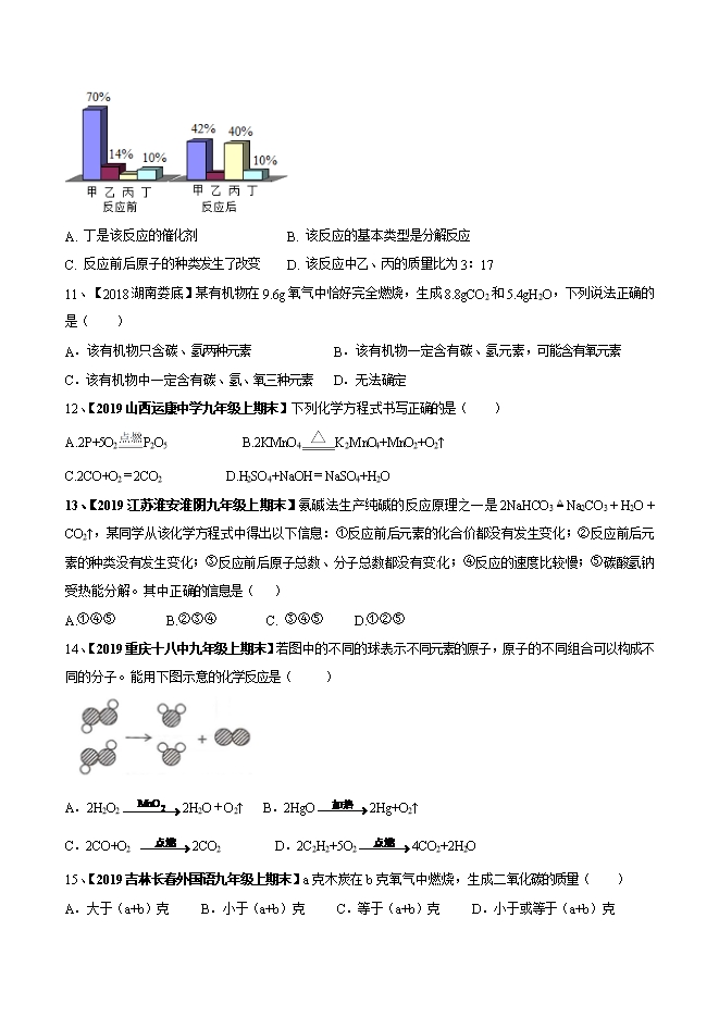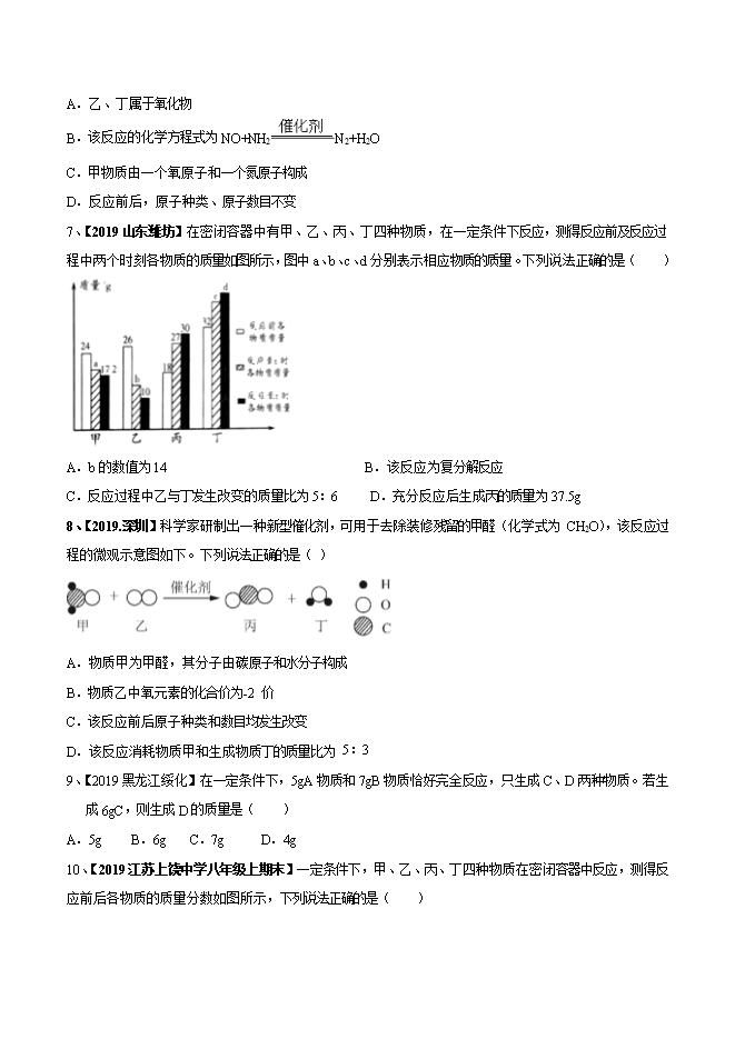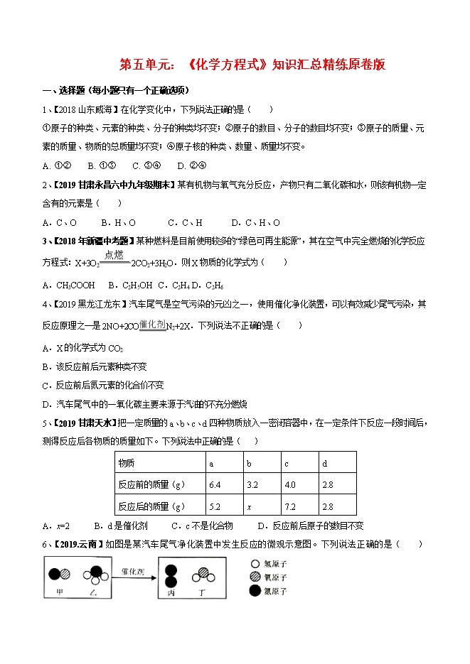 【内容简介】某有机物与氧气充分反应,产物只有二氧化碳和水,则该有机物一定含有的元素是( )A.C、O B.H、O C.C、H D.C、H、O3、【2018年新疆中考题】某种燃料是目前使用较多的“绿色可再生能源”,其在空气中完全燃烧的化学反应方程式:X+3O2 2CO2+3H2O.则X物质的化学式为( )A.CH3COOHB.C2H5OHC.C2H4D.C2H64、【2019黑龙江龙东】汽车尾气是空气污染的元凶之一,使用催化净化装置,可以有效减少尾气污染,其反应原理之一是2NO+2CO N2+2X.下列说法不正确的是( )A.X的化学式为CO2 B.该反应前后元素种类不变C.反应前后氮元素的化合价不变D.汽车尾气中的一氧化碳主要来源于汽油的不充分燃烧5、【2019甘肃天水】把一定质量的a、b、c、d四种物质放入一密闭容器中,在一定条件下反应一段时间后,测得反应后各物质的质量如下。下列说法中正确的是( )......