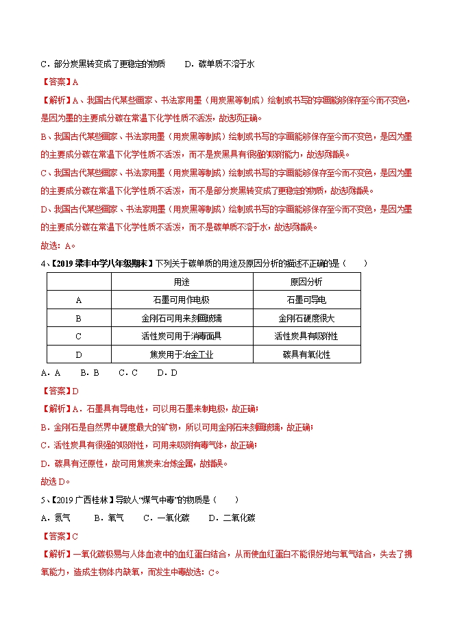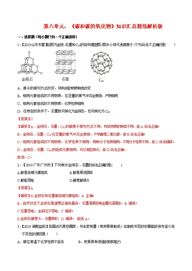 【内容简介】如图为金刚、石墨和C60的结构模型图,图中小球代表碳原子。下列说法不正确的是( ) A.原子的排列方式改变,则构成的物质种类改变B.相同元素组成的不同物质,在足量的氧气中完全燃烧,产物相同C.相同元素组成的不同物质,化学性质相同D.在特定的条件下,石墨既可转化为金刚石,也可转化为C60【答案】C【解析】A、金刚石、石墨、C60的碳原子排列方式不同,构成物质的种类不同,故A说法正确;B、金刚石、石墨、C60在足量的氧气中完全燃烧,产物都是二氧化碳,故B说法正确;C、相同元素组成的不同物质,化学性质不相同,同种分子性质相同,不同分子性质不同,故C说法错误;D、金刚石、石墨、C60的组成元素相同,可以相互转化,故D说法正确。故选:C。2、【2018广东广州市】下列有关金刚石、石墨的说法正确的是( )A.都是由碳元素组成 B.都是黑色固体C.都能导电 D.硬度都很大......