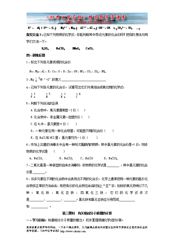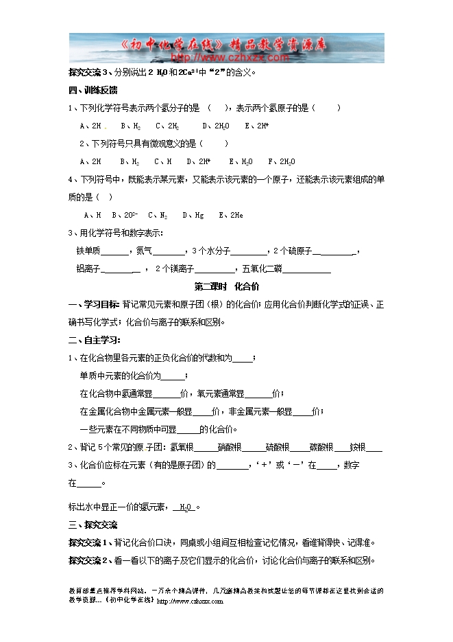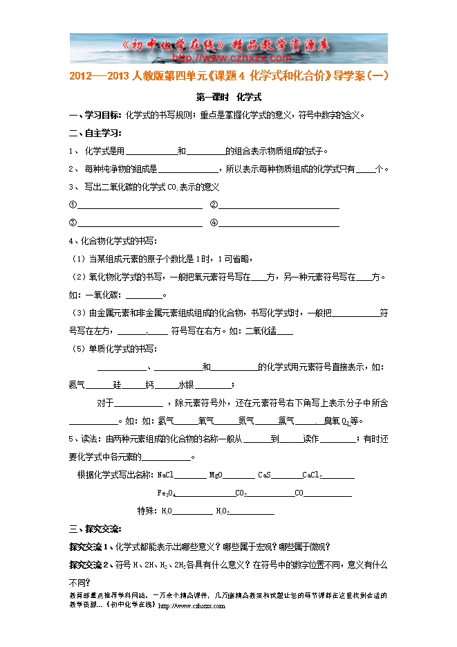 2012---2013人教版第四单元《课题4 化学式和化合价》导学案(一)