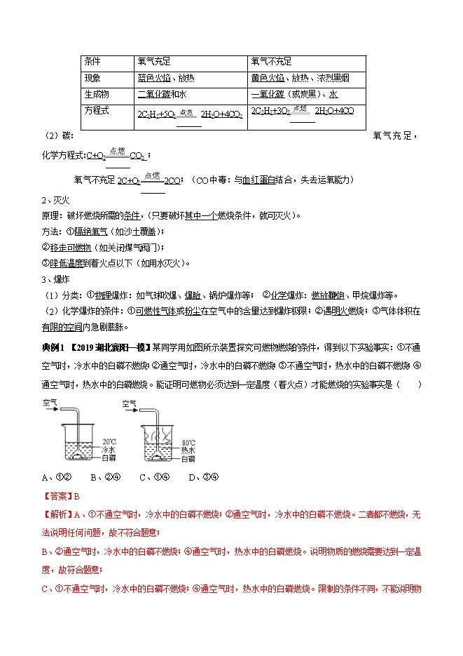 【内容简介】燃烧与灭火1、燃烧(1)定义:可燃物跟氧气发生的剧烈的发光、发热的氧化反应。(2)条件:①物质具有可燃性;②可燃物跟氧气充分接触;③可燃物的温度达到着火点以上(着火点:可燃物燃烧所需要的最低温度,是物质的固有属性,不能改变;着火点越低,越易燃烧);三者同时具备才可以燃烧。(3)促进燃烧的方法:①增大氧气的浓度;②增大可燃物与氧气的接触面积; 燃烧分类:①充分燃烧:氧气充足;②不充分燃烧:氧气不足。例如:(1)乙炔:乙炔充分燃烧不充分燃烧条件氧气充足氧气不充足现象蓝色火焰、放热黄色火焰、放热、浓烈黑烟生成物二氧化碳和水一氧化碳(或炭黑)、水方程式2C2H2+5O2 2H2O+4CO2 2C2H2+3O2 2H2O+4CO......