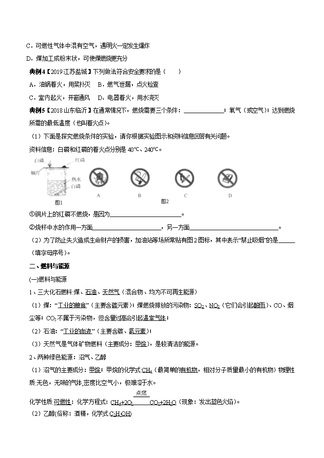 【内容简介】燃料与能源(一)燃料与能源1、三大化石燃料:煤、石油、天然气(混合物、均为不可再生能源)(1)煤:“工业的粮食”(主要含碳元素);煤燃烧排放的污染物:SO2、NO2(它们会引起酸雨)、CO、烟尘等;CO2不属于污染物,但含量过高会引起温室气体;(2)石油:“工业的血液”(主要含碳、氢元素);(3)天然气是气体矿物燃料(主要成分:甲烷),是较清洁的能源。2、两种绿色能源:沼气、乙醇(1)沼气的主要成分:甲烷;甲烷的化学式:CH4(最简单的有机物,相对分子质量最小的有机物)物理性质:无色,无味的气体,密度比空气小,极难溶于水。化学性质:可燃性:化学方程式:CH4+2O2 CO2+2H2O(现象:发出蓝色火焰)。(2)乙醇(俗称:酒精,化学式:C2H5OH)......