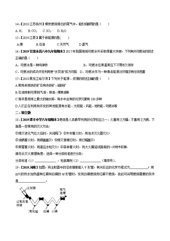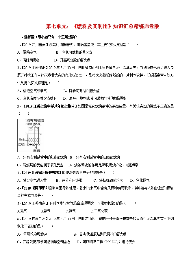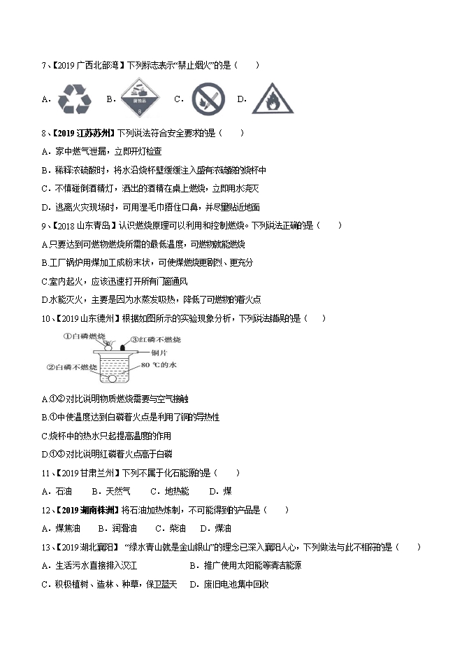 【内容简介】能使煤燃烧更充分的措施是( )A.减少空气通入量 B.充分利用热能 C.块状煤碾成粉末 D.净化尾气4、【2018湖南邵阳】吸烟有害身体健康,香烟的烟气中含有几百种有毒物质,其中易与人体血红蛋白相结合的有毒气体是( )5、【2019江苏南京】下列气体与空气混合后遇明火,可能发生爆炸的是( )A.氨气 B.氢气 C.氮气 D.二氧化碳6、【2019甘肃兰州】2019年3月30日,四川凉山因山脊的一棵云南松被雷击起火而引发森林火灾。下列说法不正确的是( )A.云南松为可燃物 B.雷击使温度达到云南松的着火点C.开辟隔离带使可燃物与空气隔绝 D.可以喷洒干粉(NaHCO3)进行灭火7、【2019广西北部湾】下列标志表示“禁止烟火”的是( )......