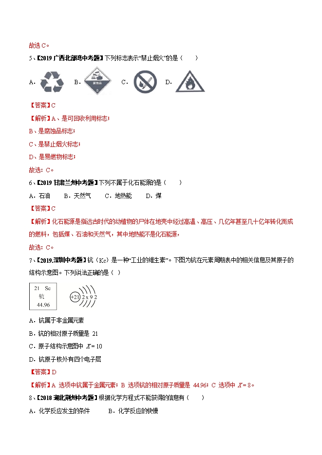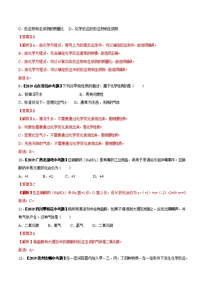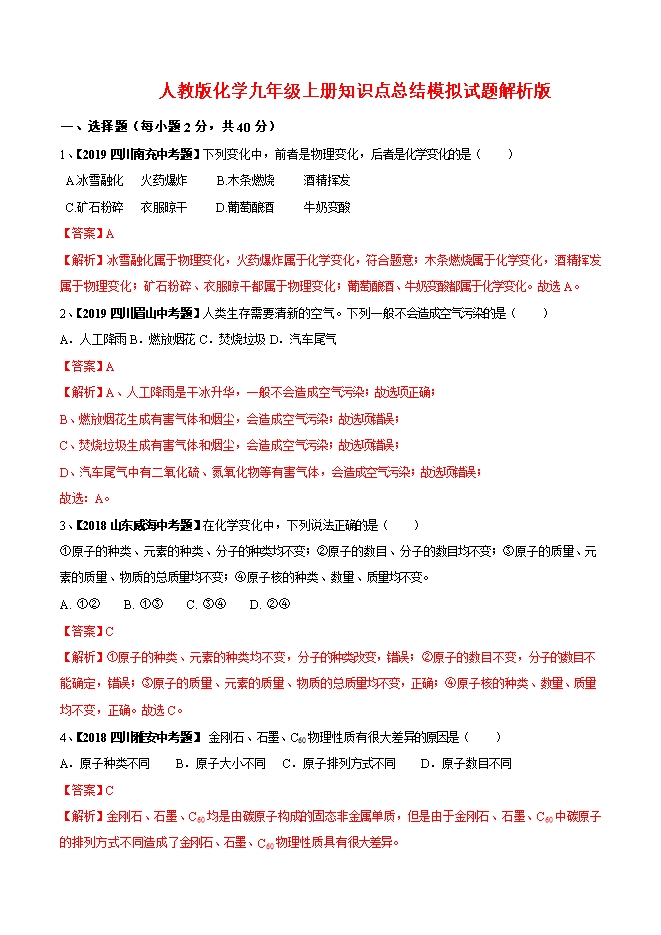 【内容简介】下列变化中,前者是物理变化,后者是化学变化的是( ) A.冰雪融化 火药爆炸 B.木条燃烧 酒精挥发 C.矿石粉碎 衣服晾干 D.葡萄酿酒 牛奶变酸【答案】A【解析】冰雪融化属于物理变化,火药爆炸属于化学变化,符合题意;木条燃烧属于化学变化,酒精挥发属于物理变化;矿石粉碎、衣服晾干都属于物理变化;葡萄酿酒、牛奶变酸都属于化学变化。故选A。2、【2019四川眉山中考题】人类生存需要清新的空气。下列一般不会造成空气污染的是( )A.人工降雨B.燃放烟花C.焚烧垃圾D.汽车尾气【答案】A【解析】A、人工降雨是干冰升华,一般不会造成空气污染;故选项正确;B、燃放烟花生成有害气体和烟尘,会造成空气污染;故选项错误;C、焚烧垃圾生成有害气体和烟尘,会造成空气污染;故选项错误;D、汽车尾气中有二氧化硫、氮氧化物等有害气体,会造成空气污染;故选项错误;故选:A。......