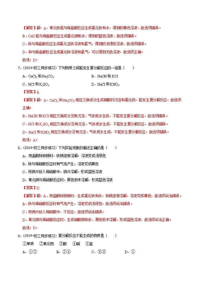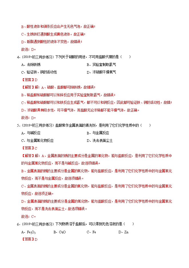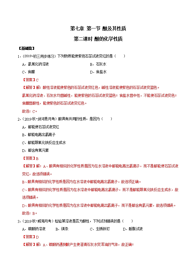 【内容简介】(2019•初三同步练习)下列物质能使紫色石蕊试液变红的是( )A.氢氧化钠溶液B.石灰水C.食醋D.食盐水【答案】C【解答】解:酸性溶液能使紫色的石蕊试液变红色,碱性溶液能使紫色的石蕊试液变蓝色。氢氧化钠溶液、石灰水均显碱性,能使紫色的石蕊试液变蓝色;食盐水显中性,不能使石蕊试液变色;食醋显酸性,能使紫色的石蕊试液变红色。故选:C。2.(2019秋•剑河县月考)酸具有共同的性质,是因为( )A.都能使石蕊试液变红B.都能电离出氢离子C.都能跟氧化铁反应生成水D.都含有氧元素【答案】B【解答】解:A、酸具有相似的化学性质是因为在水溶液中都能电离出氢离子,而不是都能使石蕊试液变红,故选项错误。B、酸具有相似的化学性质是因为在水溶液中都能电离出氢离子,故选项正确。C、酸具有相似的化学性质是因为在水溶液中都能电离出氢离子,而不是都能跟氧化铁反应生成水,故选项错误。D、酸具有相似的化学性质是因为在水溶液中都能电离出氢离子,而不是都含有氢元素,故选项错误。故选:B。......