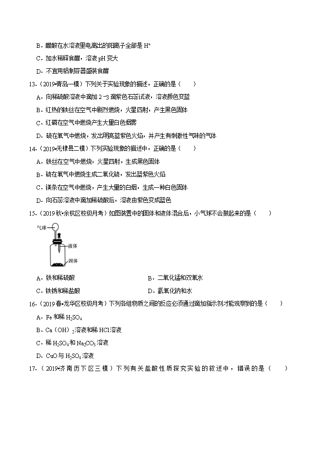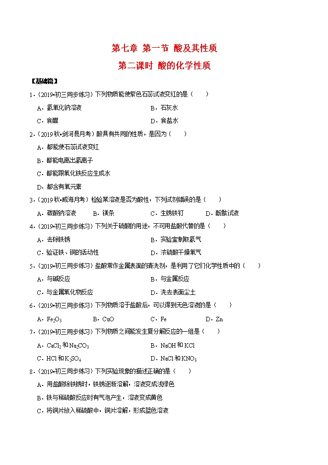 【内容简介】检验某溶液是否为酸性,下列试剂错误的是( )A.碳酸钠溶液B.镁条C.生锈铁钉D.酚酞试液4.(2019•初三同步练习)下列关于硫酸的用途,不可用盐酸代替的是( )A.去除铁锈B.实验室制取氢气C.验证铁、铜的活动性D.浓硫酸干燥氧气5.(2019•初三同步练习)盐酸常作金属表面的清洗剂,是利用了它们化学性质中的( )A.与碱反应B.与金属反应C.与金属氧化物反应D.洗去表面尘土6.(2019•初三同步练习)下列物质溶于盐酸后,可以得到无色溶液的是( )A.Fe2O3B.CuOC.FeD.Zn7.(2019•初三同步练习)下列物质之间能发生复分解反应的一组是( )A.CaCl2和Na2CO3B.NaOH和KClC.HCl和K2SO4D.NaCl和KNO38.(2019•初三同步练习)下列实验现象的描述正确的是( )A.用盐酸除铁锈时,铁锈逐渐溶解,溶液变成浅绿色B.铁与稀硫酸反应时有气泡产生,溶液变成黄色C.将铜片放入稀硫酸中,铜片溶解,形成蓝色溶液......