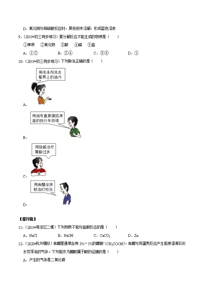 2020年春鲁教版九年级化学下册《专题7.1 酸及其性质(第2课时)》同步练习(原卷版)