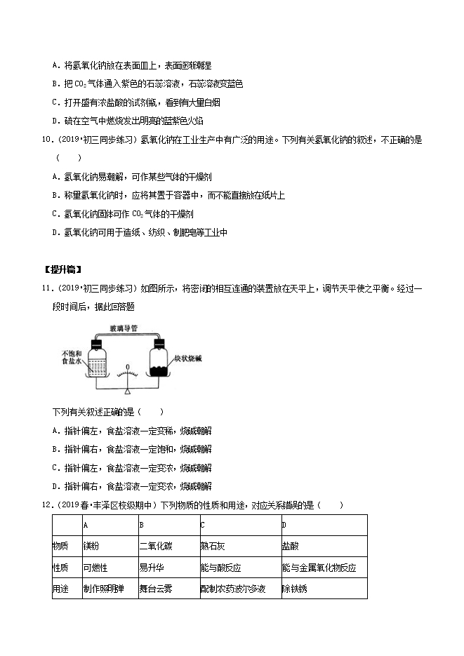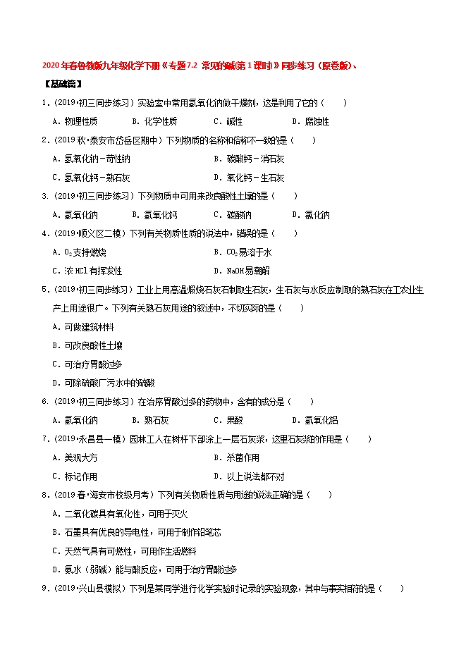 2020年春鲁教版九年级化学下册《专题7.2 常见的碱(第1课时)》同步练习(原卷版)