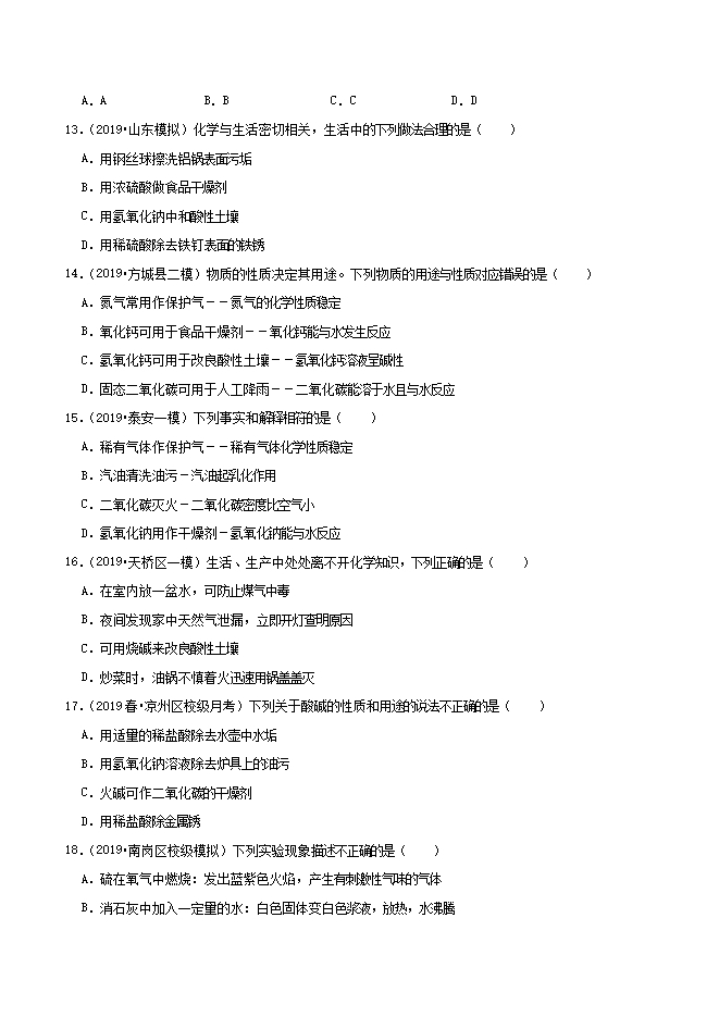 【内容简介】下列物质的名称和俗称不一致的是( )A.氢氧化钠﹣苛性钠B.碳酸钙﹣消石灰C.氢氧化钙﹣熟石灰D.氧化钙﹣生石灰3.(2019•初三同步练习)下列物质中可用来改良酸性土壤的是( )A.氢氧化钠B.氢氧化钙C.碳酸钠D.氯化钠4.(2019•顺义区二模)下列有关物质性质的说法中,错误的是( )A.O2支持燃烧B.CO2易溶于水C.浓HCl有挥发性D.NaOH易潮解5.(2019•初三同步练习)工业上用高温煅烧石灰石制取生石灰,生石灰与水反应制取的熟石灰在工农业生产上用途很广。下列有关熟石灰用途的叙述中,不切实际的是( )A.可做建筑材料B.可改良酸性土壤C.可治疗胃酸过多D.可除硫酸厂污水中的硫酸6.(2019•初三同步练习)在治序胃酸过多的药物中,含有的成分是( )A.氢氧化钠B.熟石灰C.果酸D.氢氧化铝7.(2019•永昌县一模)园林工人在树杆下部涂上一层石灰浆,这里石灰浆的作用是(......