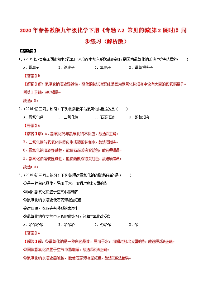 2020年春鲁教版九年级化学下册《专题7.2 常见的碱(第2课时)》同步练习(解析版)