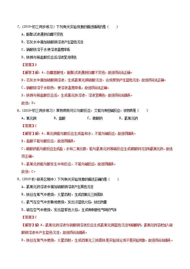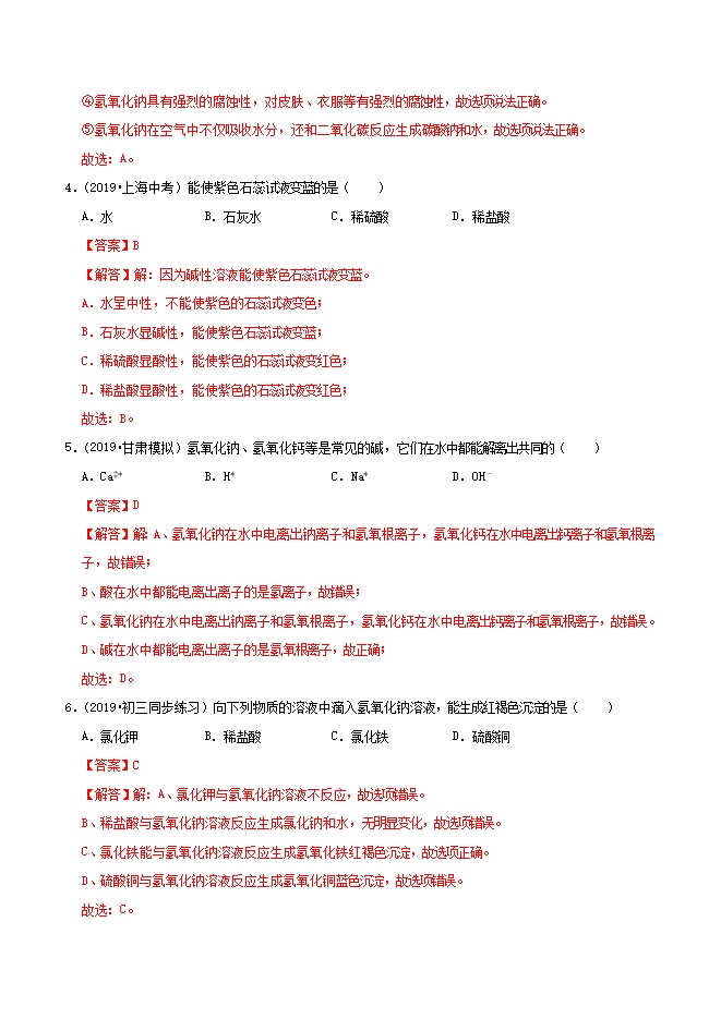 【内容简介】氢氧化钠溶液中加入酚酞试液变红,是因为氢氧化钠溶液中含有大量的( )A.氢离子B.钠离子C.氧离子D.氢氧根离子【答案】D【解答】解:氢氧化钠溶液显碱性,能使酚酞试液变红是因为氢氧化钠溶液中含有大量的氢氧根离子。所以D正确,ABC错误。故选:D。2.(2019•初三同步练习)下列物质能不与氢氧化钠反应的是( )A.氢氧化钙B.二氧化碳C.石蕊溶液D.酚酞溶液【答案】A【解答】解:A、氢氧化钙与氢氧化钠不反应,故选项正确。B、二氧化碳与氢氧化钠反应生成碳酸钠和水,故选项错误。C、氢氧化钠溶液显碱性,能使石蕊溶液变蓝色,故选项错误。D、氢氧化钠溶液显碱性,能使酚酞溶液变红色,故选项错误。故选:A。3.(2019•初三同步练习)下列各项对氢氧化钠的描述正确的是( )①是一种白色晶体,易溶于水,溶解时放出大量的热②固体氢氧化钠置于空气中易潮解③氢氧化钠水溶液使石蕊溶液呈红色④对皮肤、衣服等有强烈的腐蚀性......