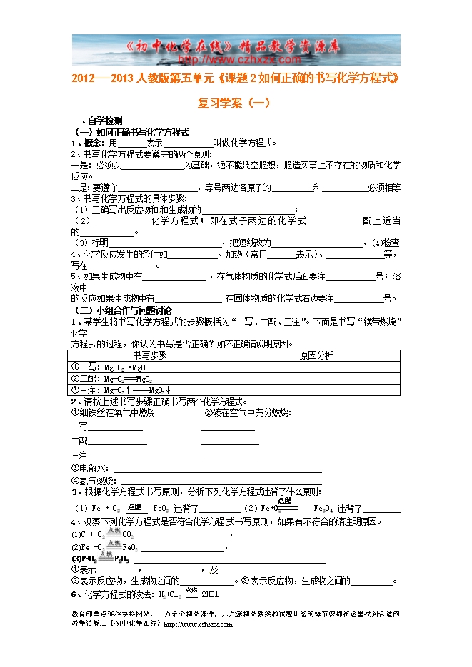 2012---2013人教版第五单元《课题2 如何正确的书写化学方程式》导学案(一)